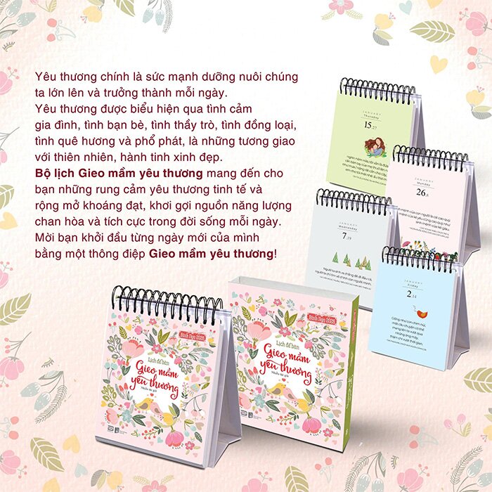 Yêu thương chính là sức mạnh dưỡng nuôi chúng ta lớn lên và trưởng thành mỗi ngày. Yêu thương được biểu hiện qua tình cảm gia đình, tình bạn bè, tình thầy trò, tình đồng loại, tình quê hương và phổ phát, là những tương giao với thiên nhiên, hành tinh xinh đẹp. Bộ lịch Gieo mầm yêu thương mang đến cho bạn những rung cảm yêu thương tinh tế và rộng mở khoáng đạt, khơi gợi nguồn năng lượng chan hòa và tích cực trong đời sống mỗi ngày.