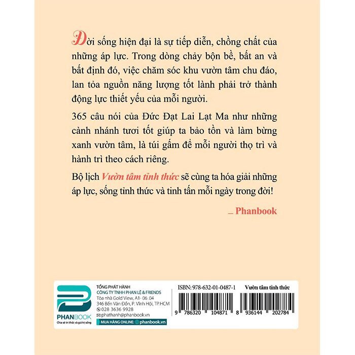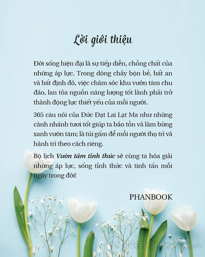 Đời sống hiện đại là sự tiếp diễn, chồng chất của những áp lực. Trong dòng chảy bộn bề, bất an và bất định đó, việc chăm sóc khu vườn tâm chu đáo, lan tỏa nguồn năng lượng tốt lành phải trở thành động lực thiết yếu của mỗi người. 365 câu nói của Đức Đạt Lai Lạt Ma như những cành nhánh tươi tốt giúp ta bảo tồn và làm bùng xanh vườn tâm; là túi gấm để mỗi người thọ trì và hành trì theo cách riêng.