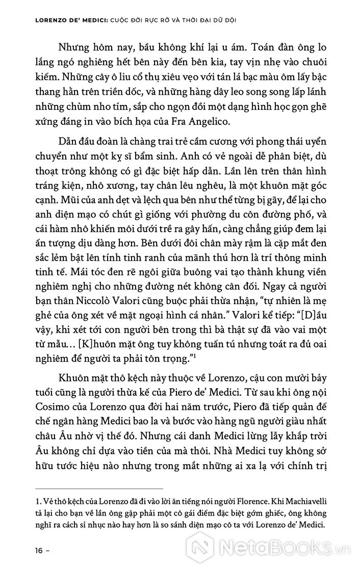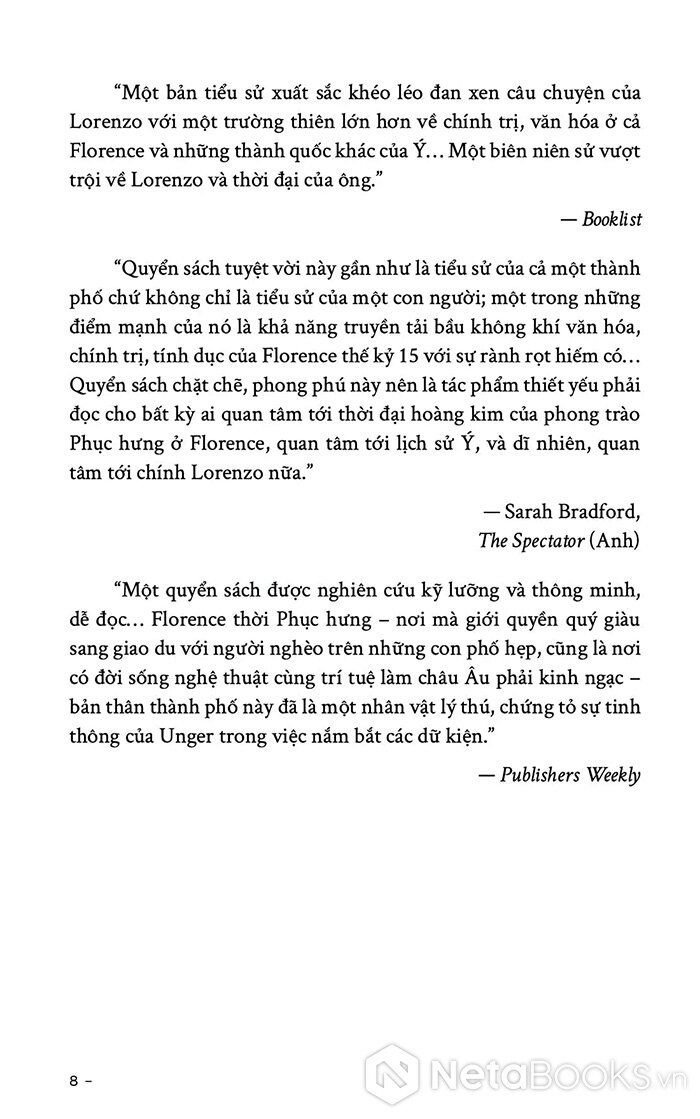Bằng giọng kể sinh động và tư liệu phong phú, Unger tái hiện không chỉ con người Lorenzo - vừa nhà cầm quyền, vừa thi sĩ, vừa người bảo trợ nghệ thuật - mà còn cả một thời đại rực sáng và tàn khốc của nước Ý.