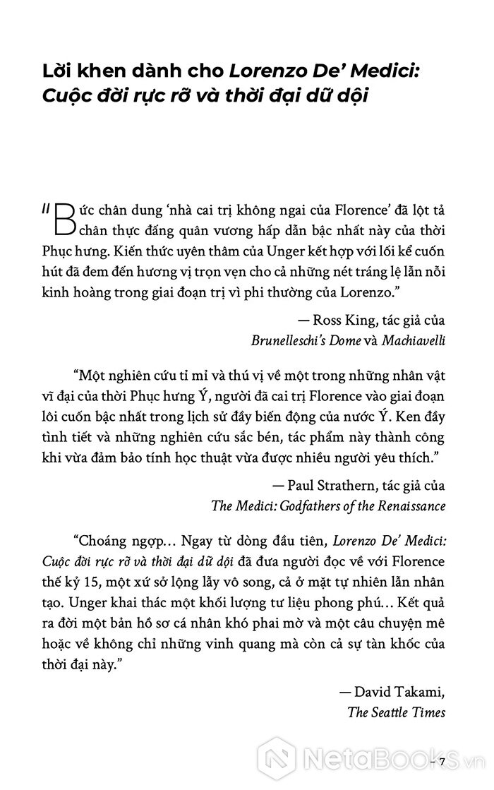 “Bức chân dung ‘nhà cai trị không ngai của Florence’ đã lột tả chân thực đấng quân vương kỳ thú bậc nhất này của thời Phục hưng. Kiến thức uyên thâm của Unger kết hợp với lối kể cuốn hút đã đem đến hương vị trọn vẹn cho cả những nét tráng lệ lẫn nỗi kinh hoàng trong giai đoạn trị vì phi thường của Lorenzo.” - Ross King, tác giả của Brunelleschi’s Dome và Machiavelli