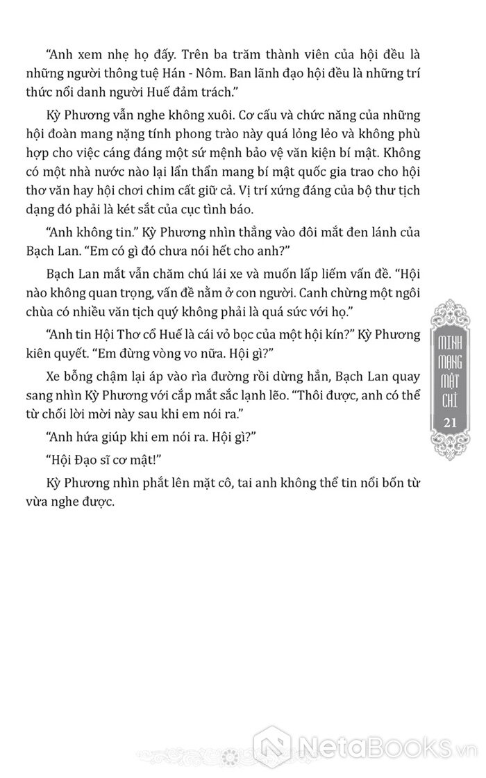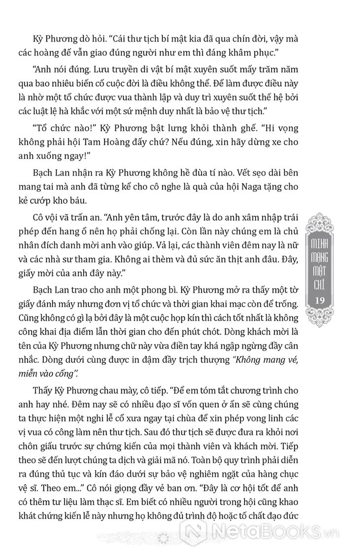 Vào cuộc anh mới biết mình đang tham gia một nghi lễ bàn giao thần bí giữa hai thế lực cổ xưa là Hội Đạo sĩ cơ mật và những hậu duệ hoàng tộc có sứ mệnh đặc biệt. Thế nhưng nhân tố bí ẩn bất ngờ xuất hiện làm cho lễ bàn giao không thực hiện. Kỳ Phương định thoái lui song đã quá muộn. Anh bị cuốn vào cuộc đấu tranh giữa hàng loạt các thể lực đối nghịch và trở thành nhân tố chủ chốt trong việc tìm kiếm kho báu.