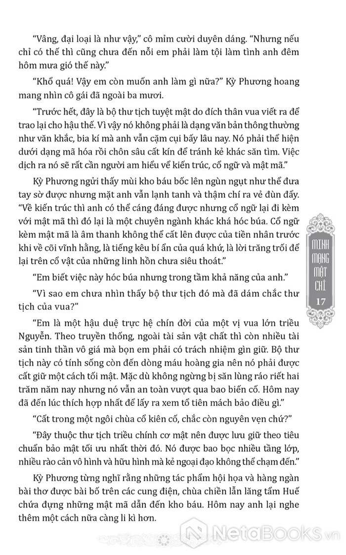 Khoác lên mình vỏ bọc là một kiến trúc sư nam tính, hào hoa, yêu lịch sử - Kỳ Phương thực chất là một người chuyên đi tìm kho báu. Sau một thời gian tạo mối quan hệ anh đã được một người bạn mang dòng dõi hoàng tộc đề nghị tham gia khai quật và giải mã một thư tịch cổ của vua Minh Mạng.