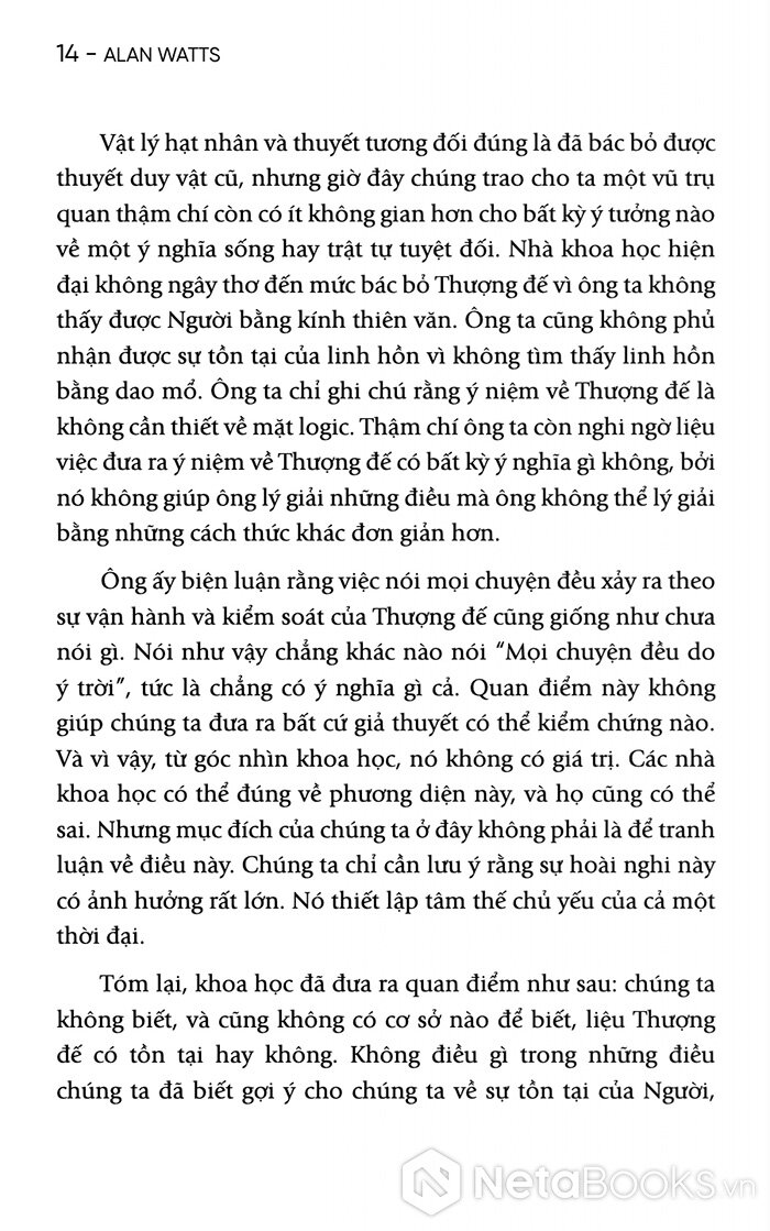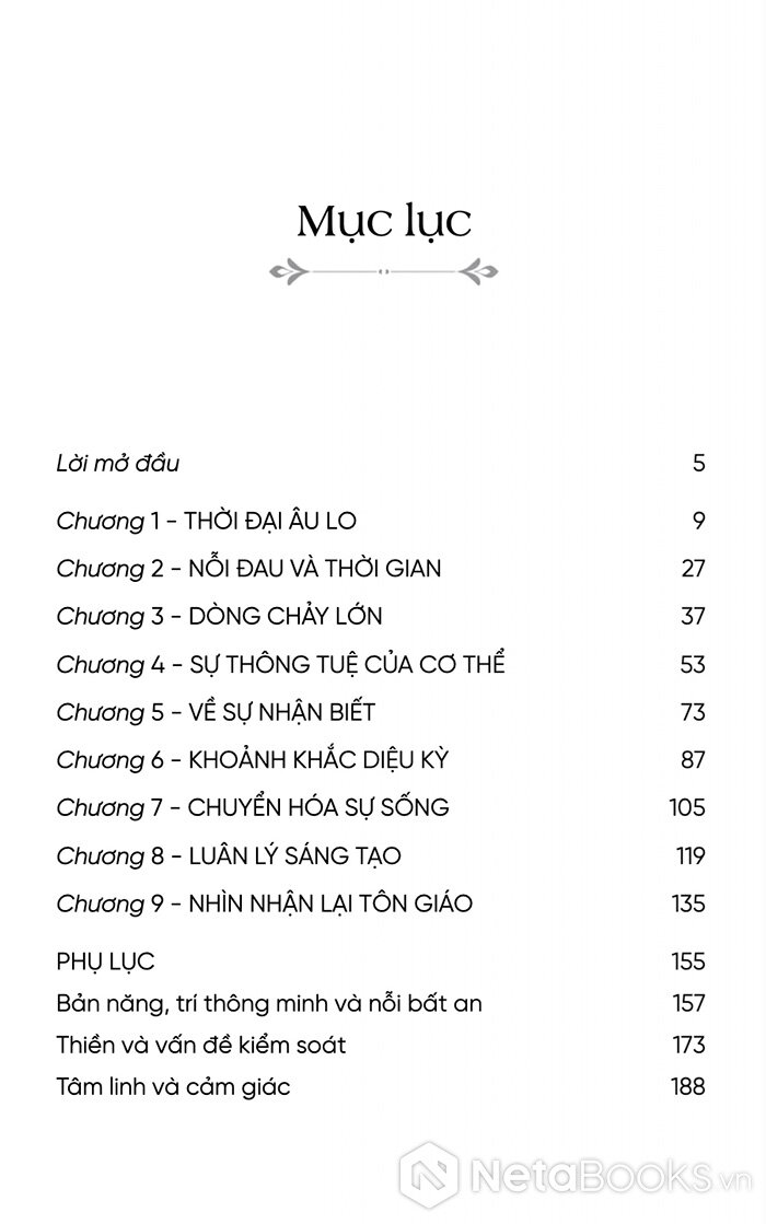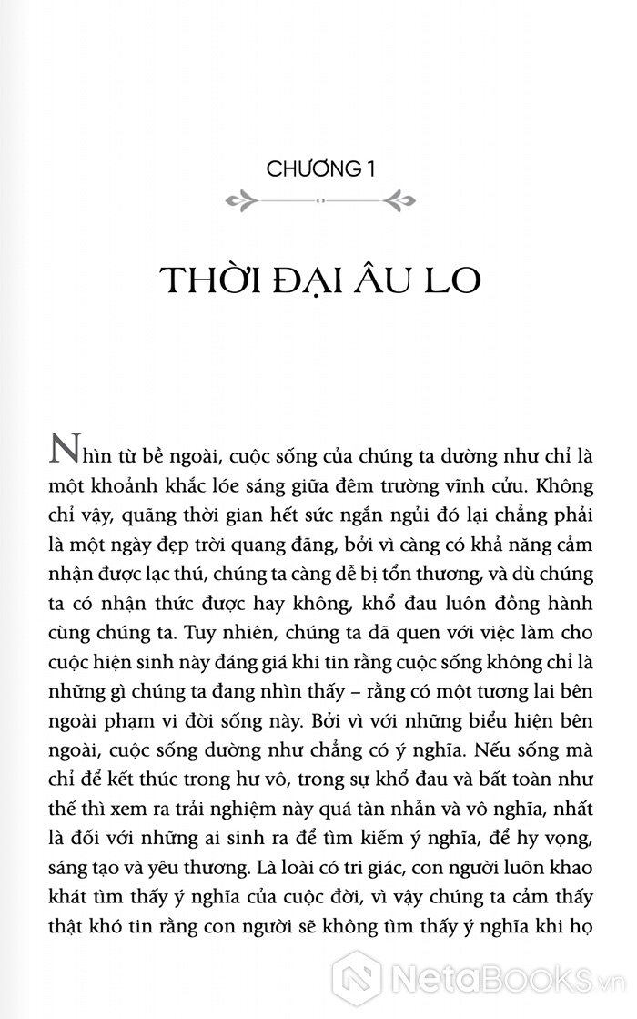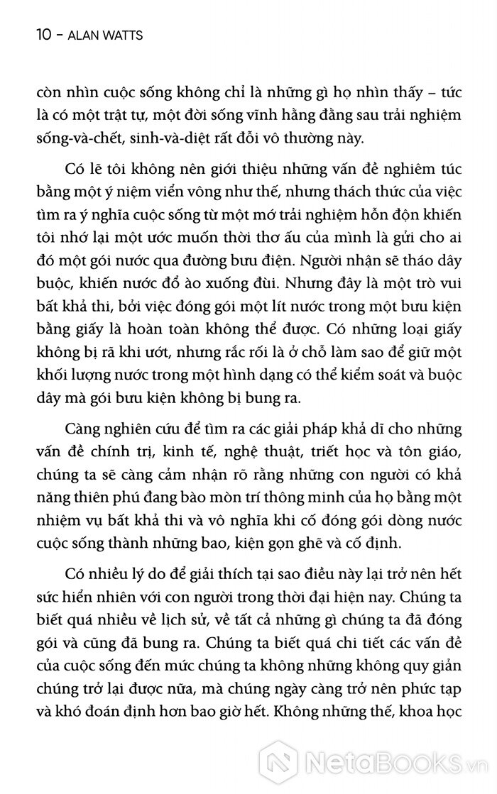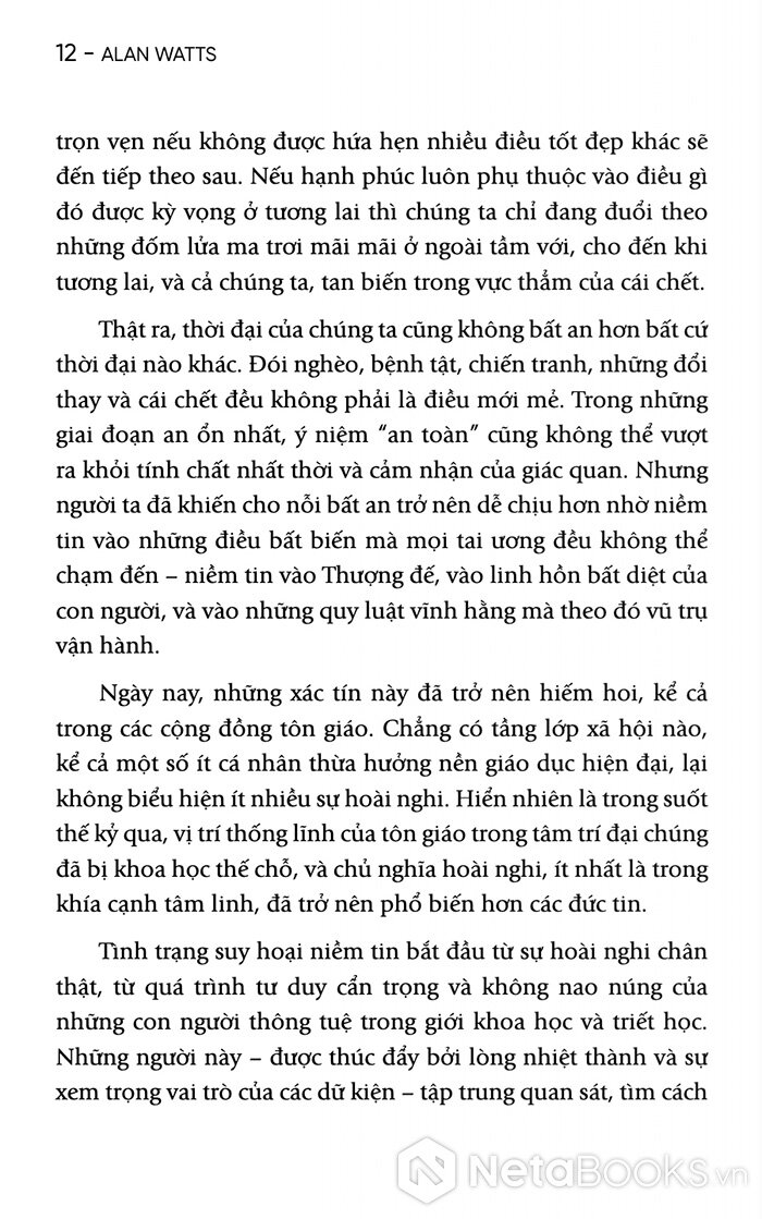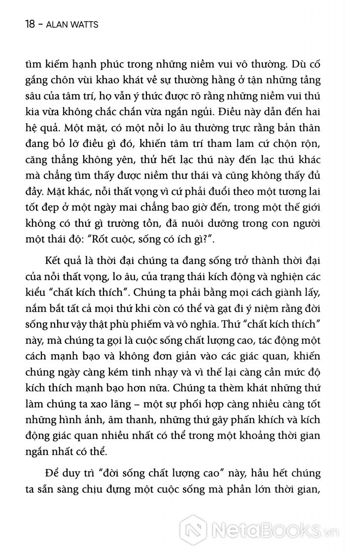 Với 200 trang sách, Alan Watts sẽ giúp người đọc nhận ra rằng nỗi lo âu không chỉ là vấn đề cá nhân, mà còn là một đặc điểm của thời đại. Nhưng chính từ sự bất an ấy, con người sẽ có thể tìm thấy một dạng minh triết mới: minh triết của việc chấp nhận sự vô thường và sống trọn vẹn trong dòng chảy của đời sống.