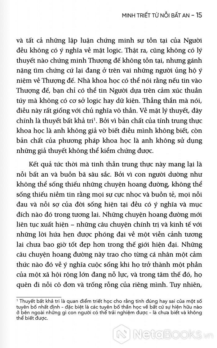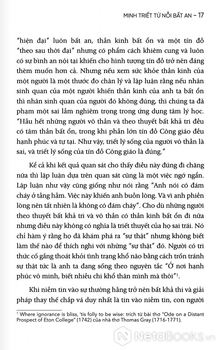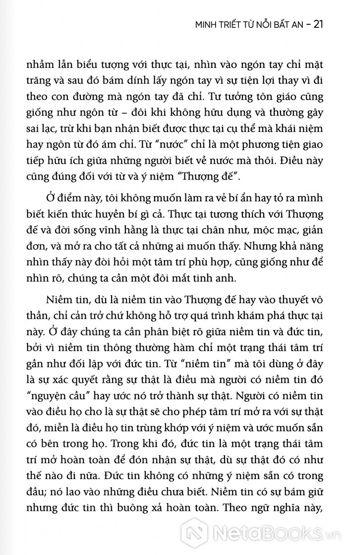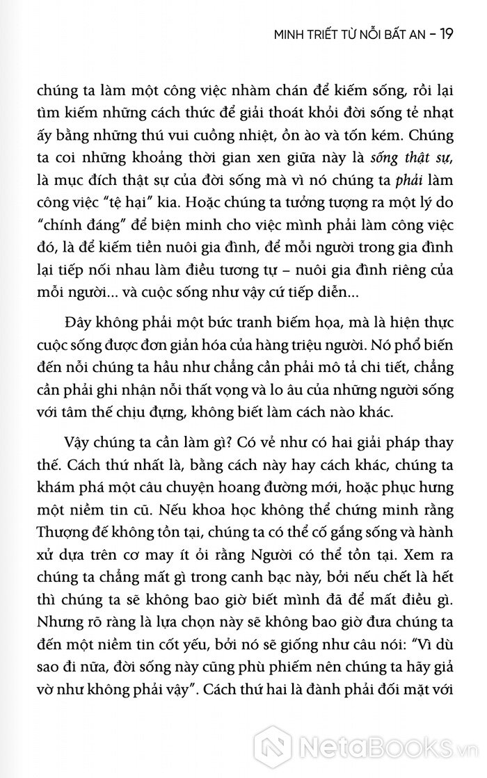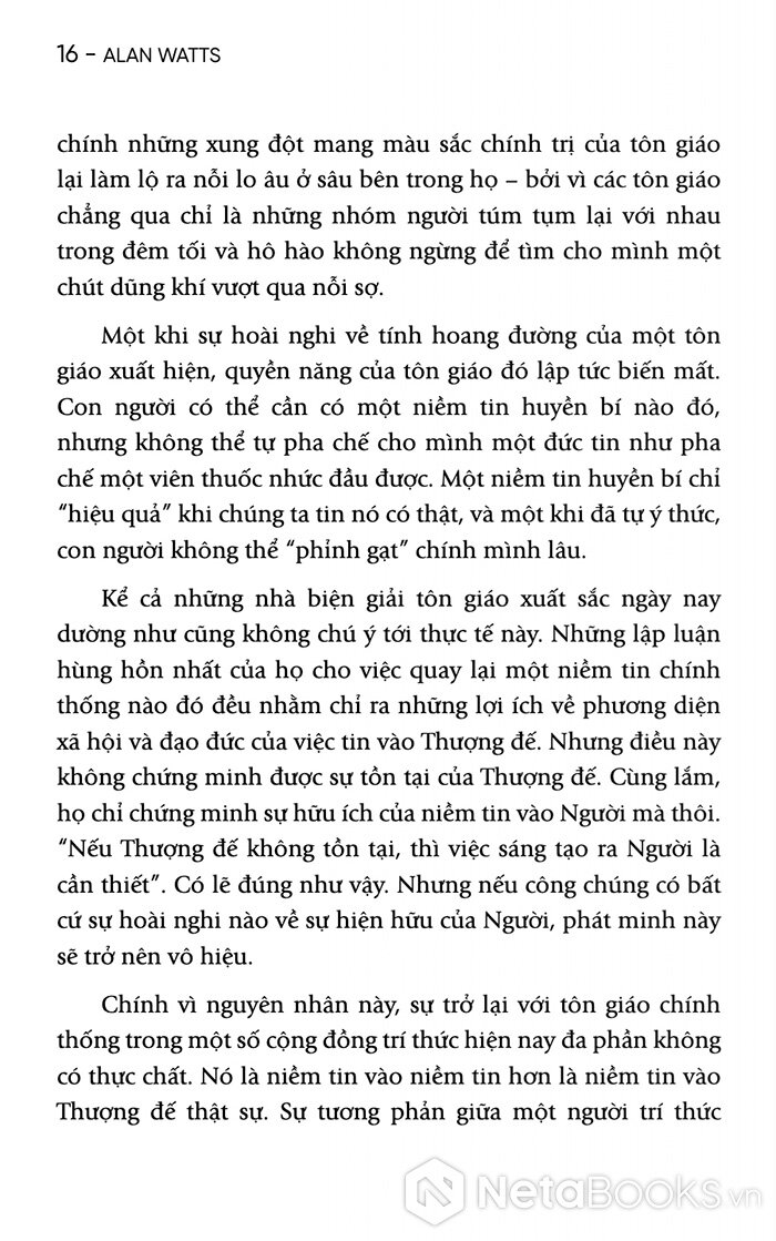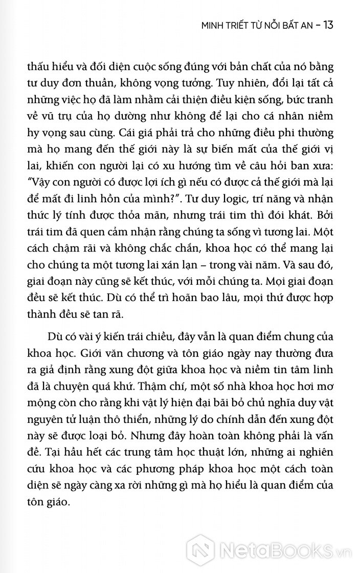 Với 200 trang sách, Alan Watts sẽ giúp người đọc nhận ra rằng nỗi lo âu không chỉ là vấn đề cá nhân, mà còn là một đặc điểm của thời đại. Nhưng chính từ sự bất an ấy, con người sẽ có thể tìm thấy một dạng minh triết mới: minh triết của việc chấp nhận sự vô thường và sống trọn vẹn trong dòng chảy của đời sống.