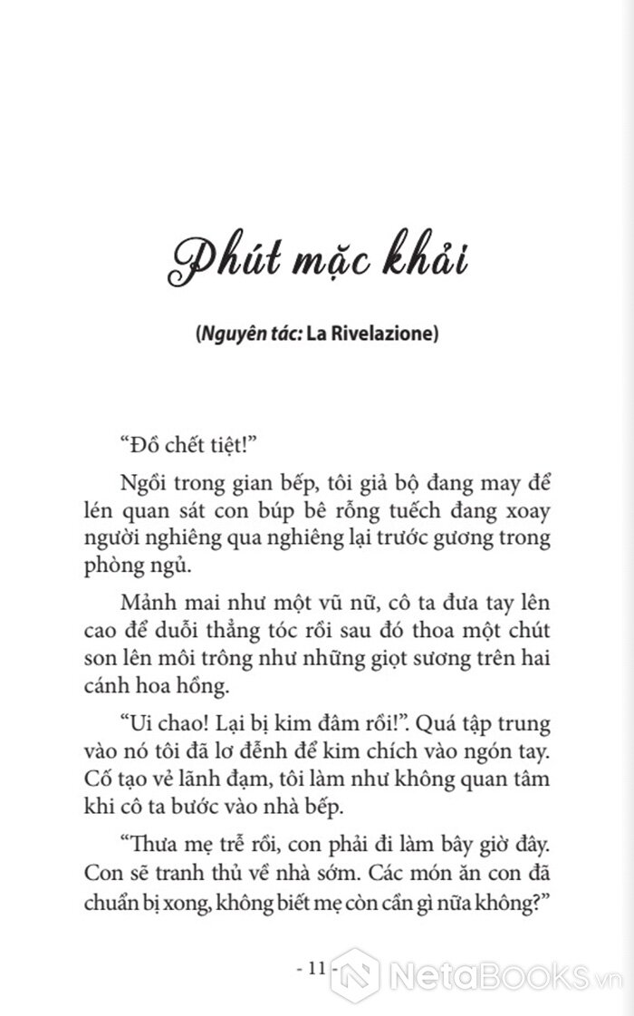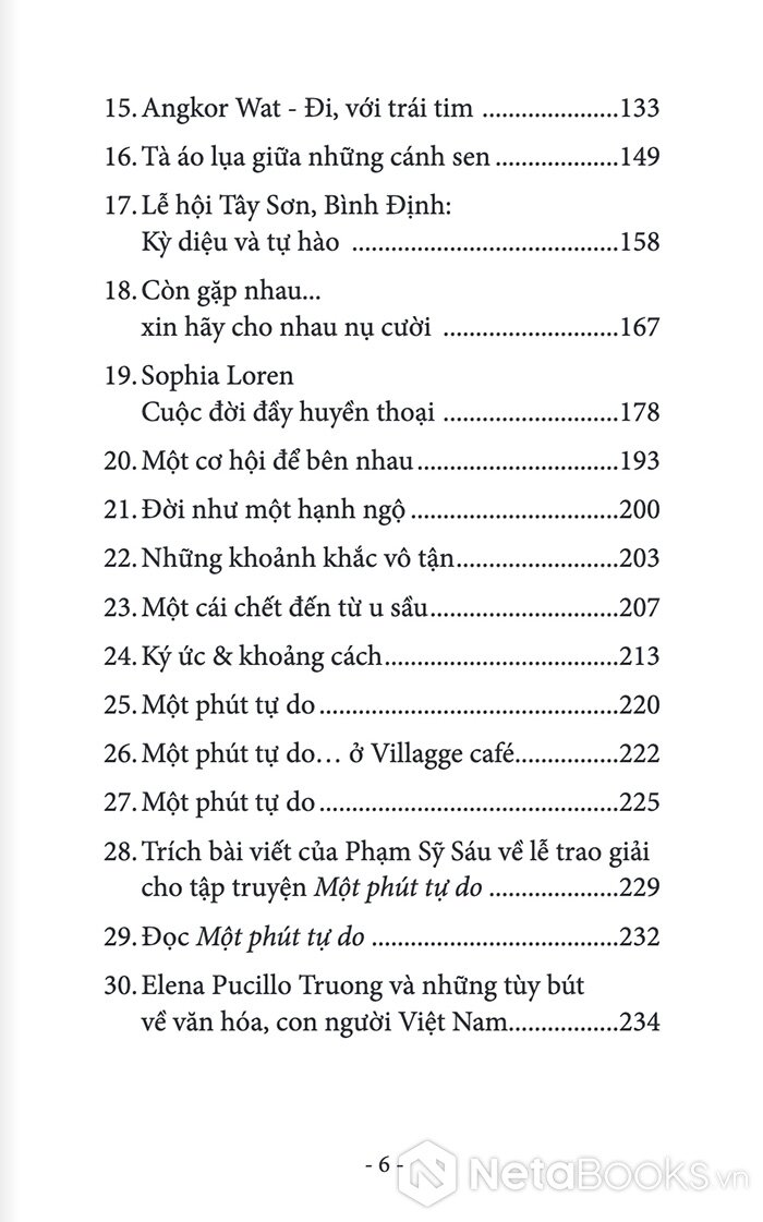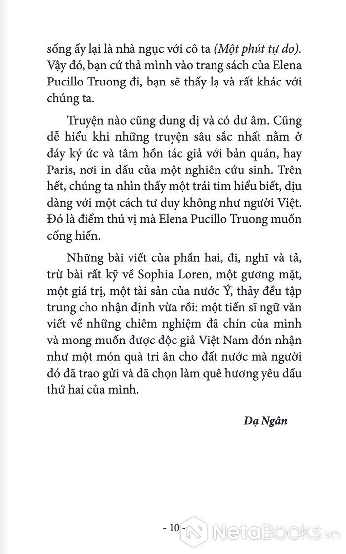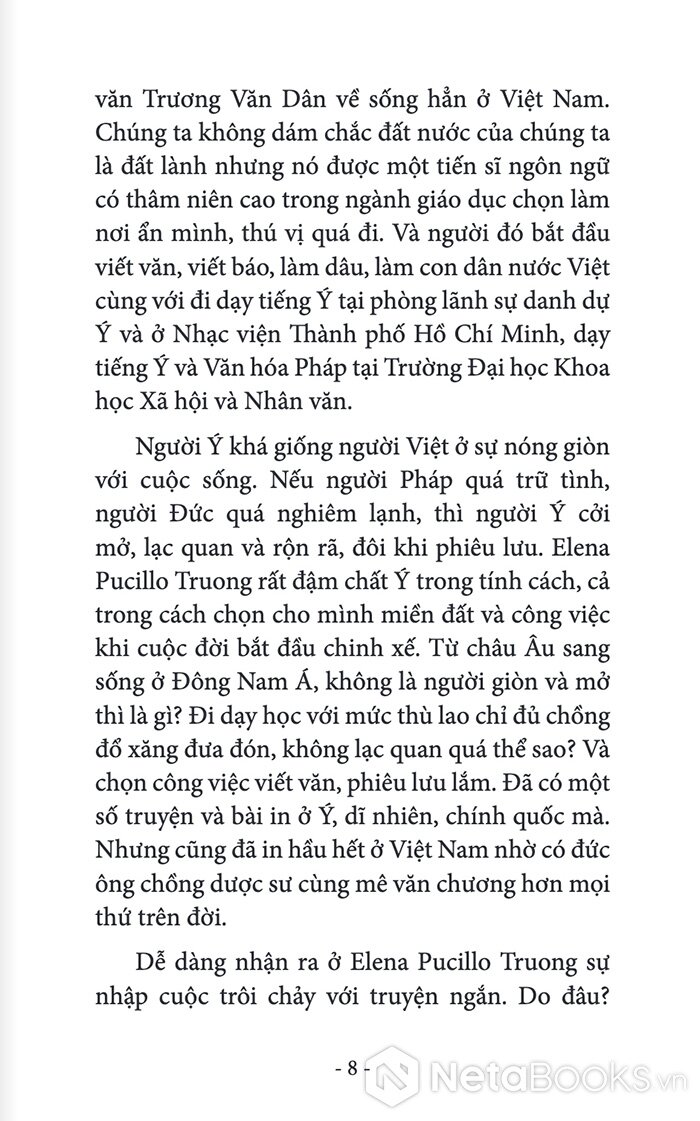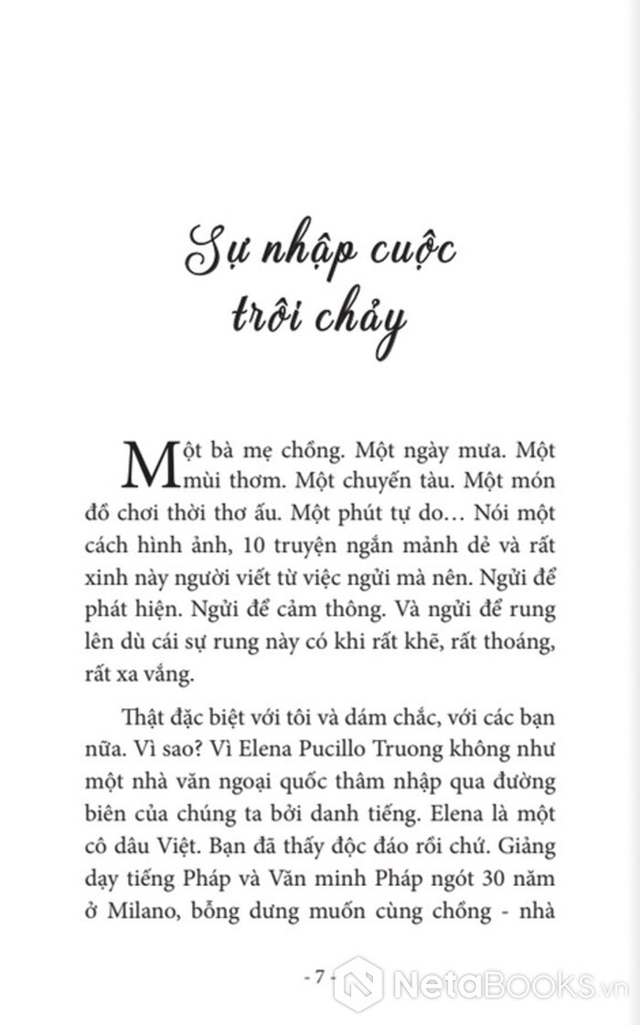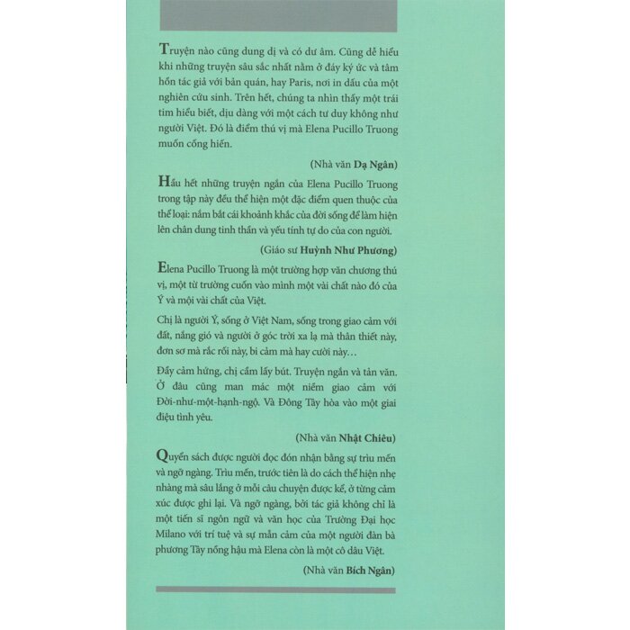 "Elena Pucillo Truong là một trường hợp văn chương thú vị, một từ trường cuốn vào mình một vài chất nào đó của Ý và một vài chất của Việt.Chị là người Ý, sống ở Việt Nam, sống trong giao cảm với đất, nắng gió và người ở góc trời xa lạ mà thân thiết này, đơn sơ mà rắc rối này, bi cảm mà hay cười này.Đầy cảm hứng, chị cầm bút. Truyện ngắn và tản văn. Ở đâu cũng man mác một niềm giao cảm với Đời - như - một - hạnh - ngộ. Và Đông Tây hòa hợp vào một giai điệu tình yêu" - Nhà văn Nhật Chiêu