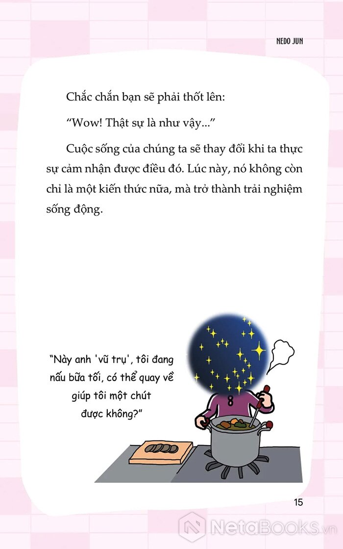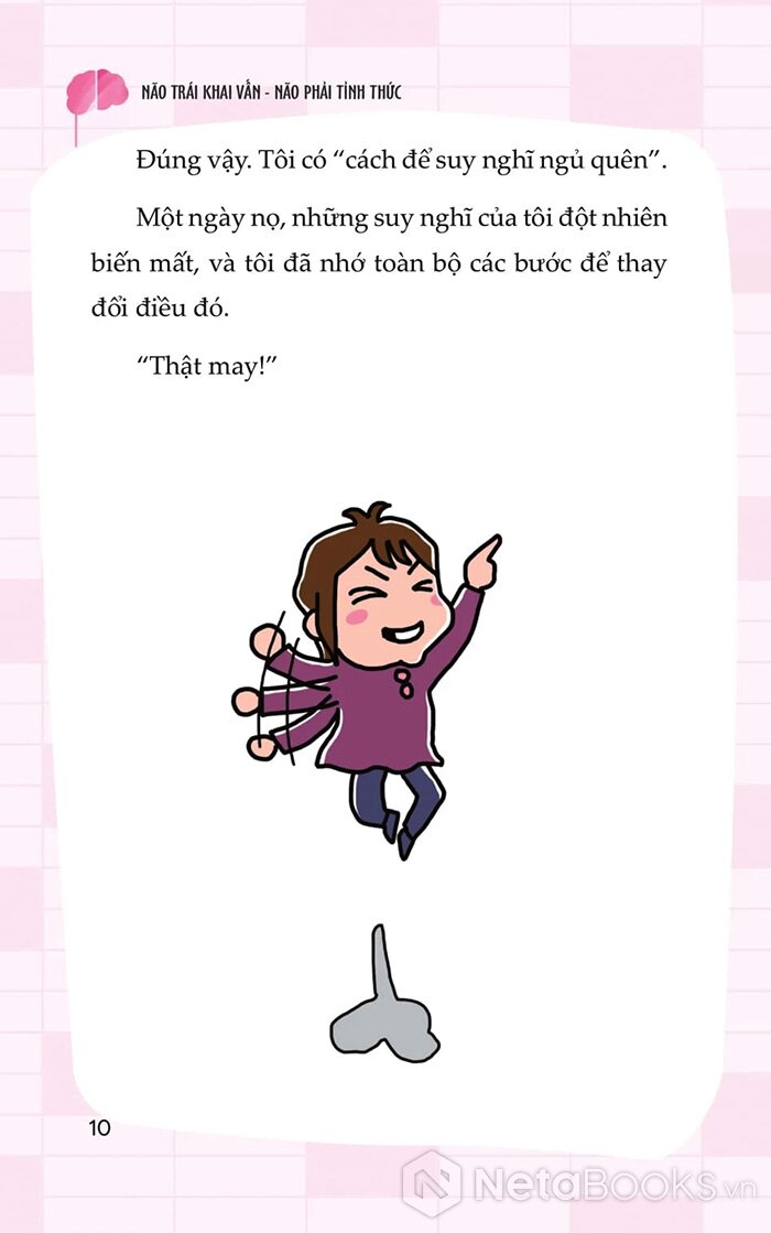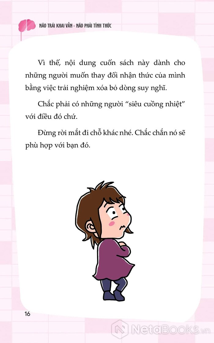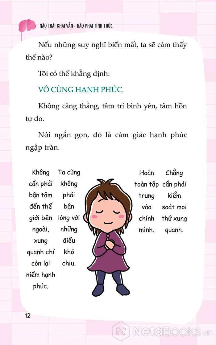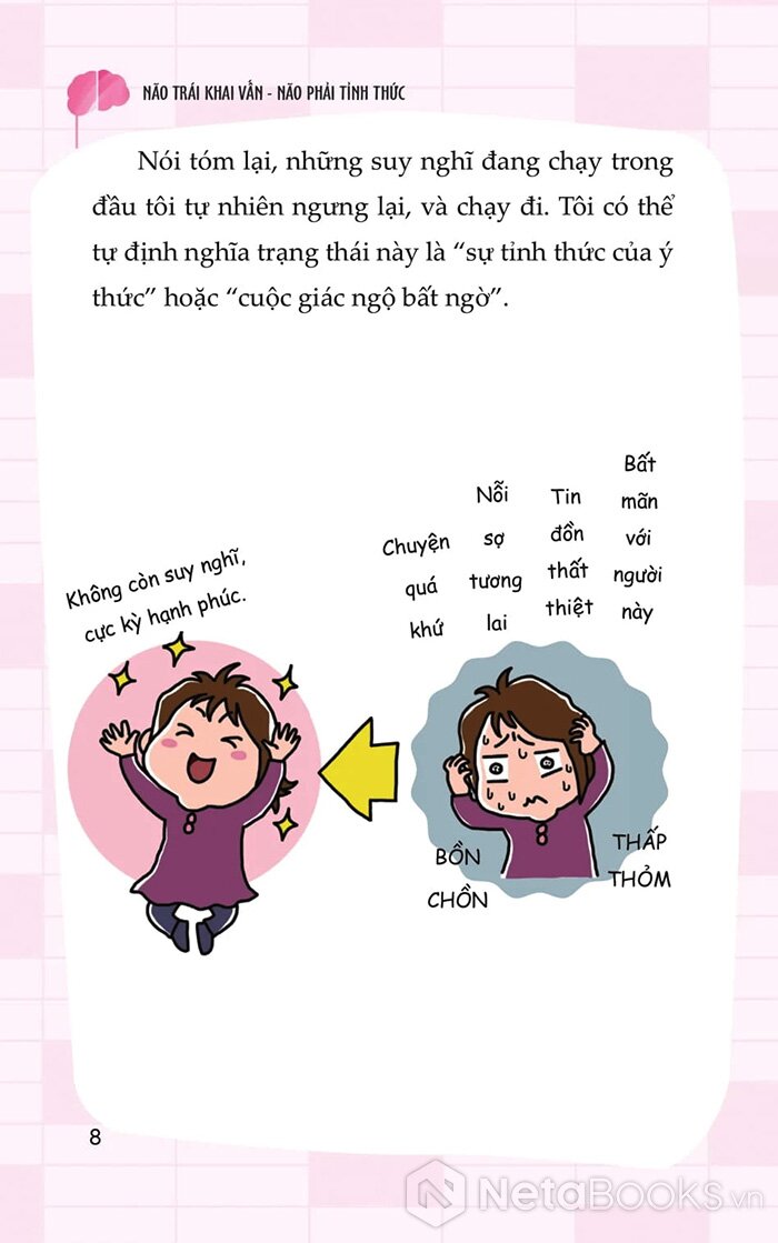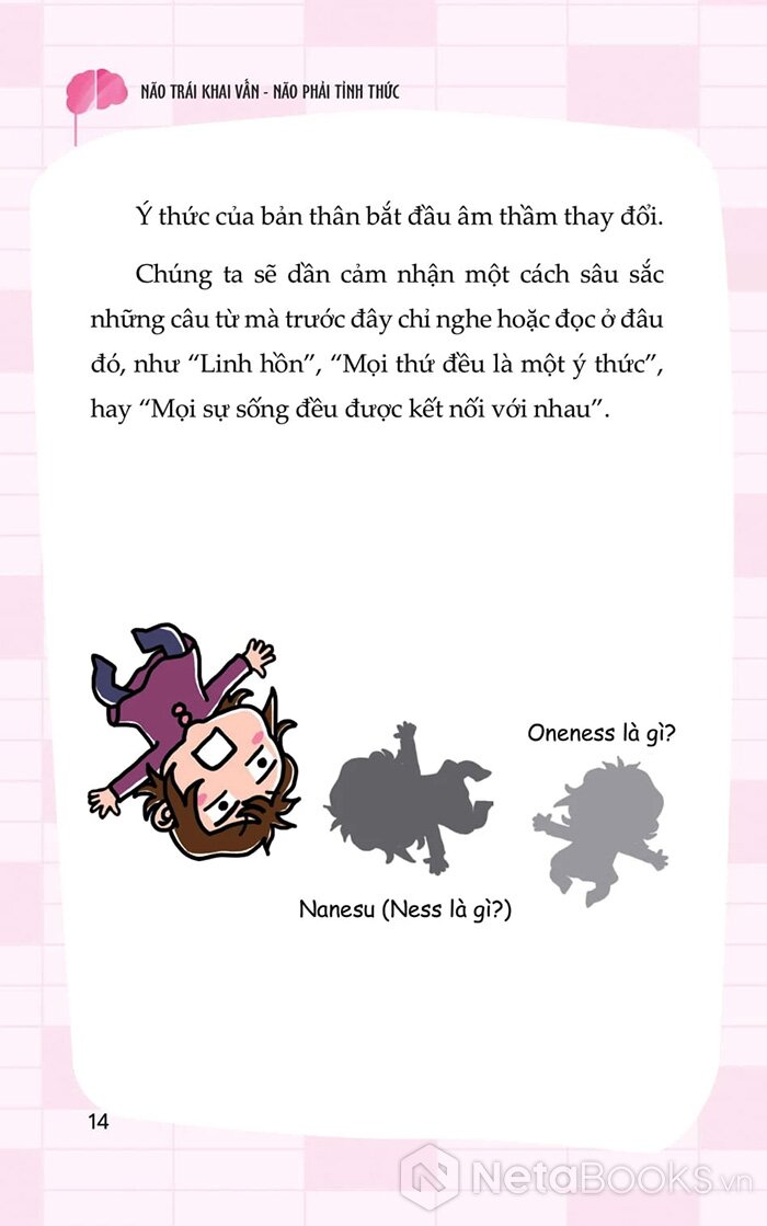 Trong cuốn “Não trái khai vấn, Não phải tỉnh thức” tác giả Nedo Jun kể lại hành trình kỳ lạ của chính mình - khi một ngày nọ, toàn bộ dòng suy nghĩ trong đầu cô đột ngột biến mất, không còn suy diễn, không còn lo toan. Từ trải nghiệm đó, cô đã khám phá ra một phương pháp gồm 5 bước thực hành giúp bất kỳ ai cũng có thể chuyển hóa ý thức: thoát khỏi suy nghĩ mơ hồ, trở về với sự tĩnh lặng, cân bằng giữa lý trí và trực giác.