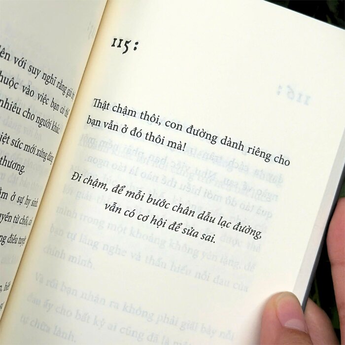 Cuốn tản văn cũng là lời nhắn nhủ dịu dàng về việc buông xuống những gánh nặng mà ta vẫn âm thầm mang theo suốt hành trình trưởng thành. Buông xuống áp lực phải làm hài lòng tất cả mọi người - từ gia đình, bạn bè cho đến người mình yêu. Và sâu xa hơn, là buông bỏ cảm giác nặng nề rằng ta phải trở thành một “chuẩn mực” nào đó, phải đủ tốt, đủ giỏi, đủ hoàn hảo thì mới xứng đáng được yêu thương và ghi nhận.