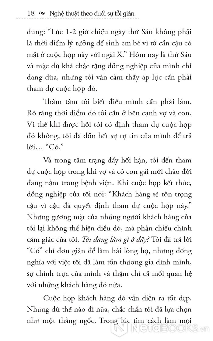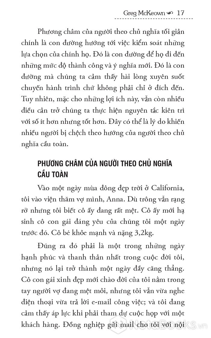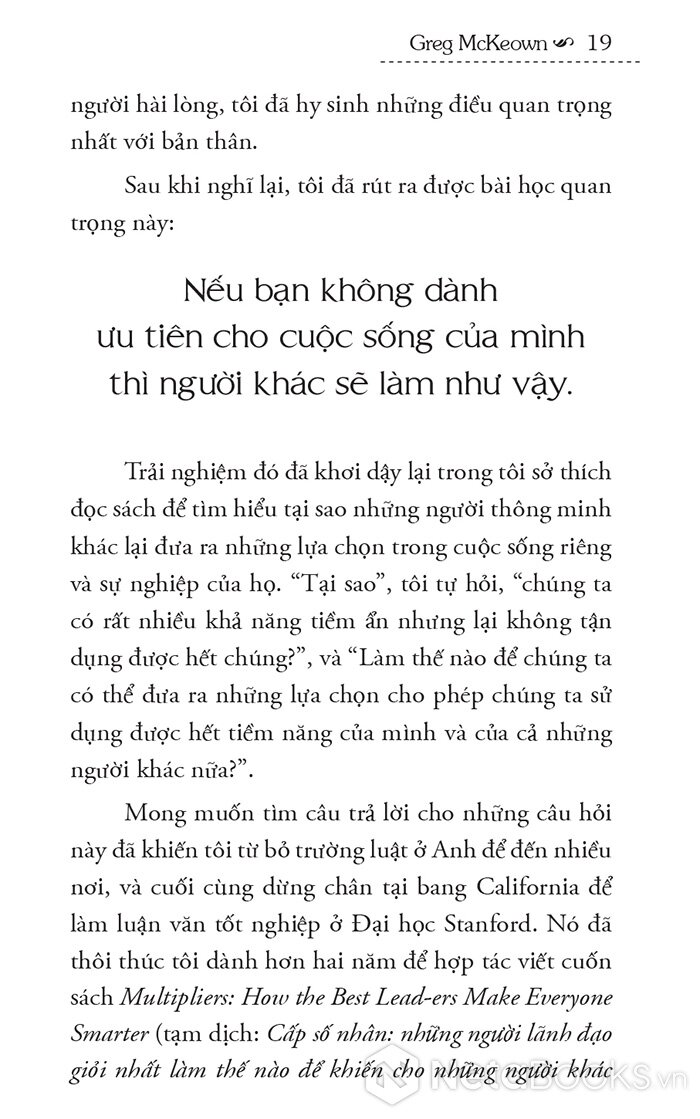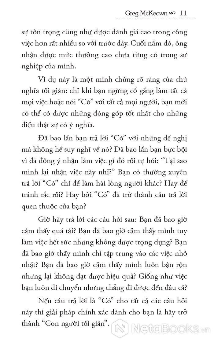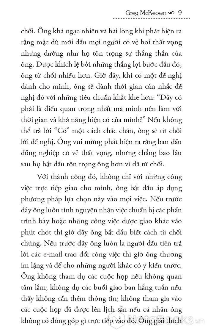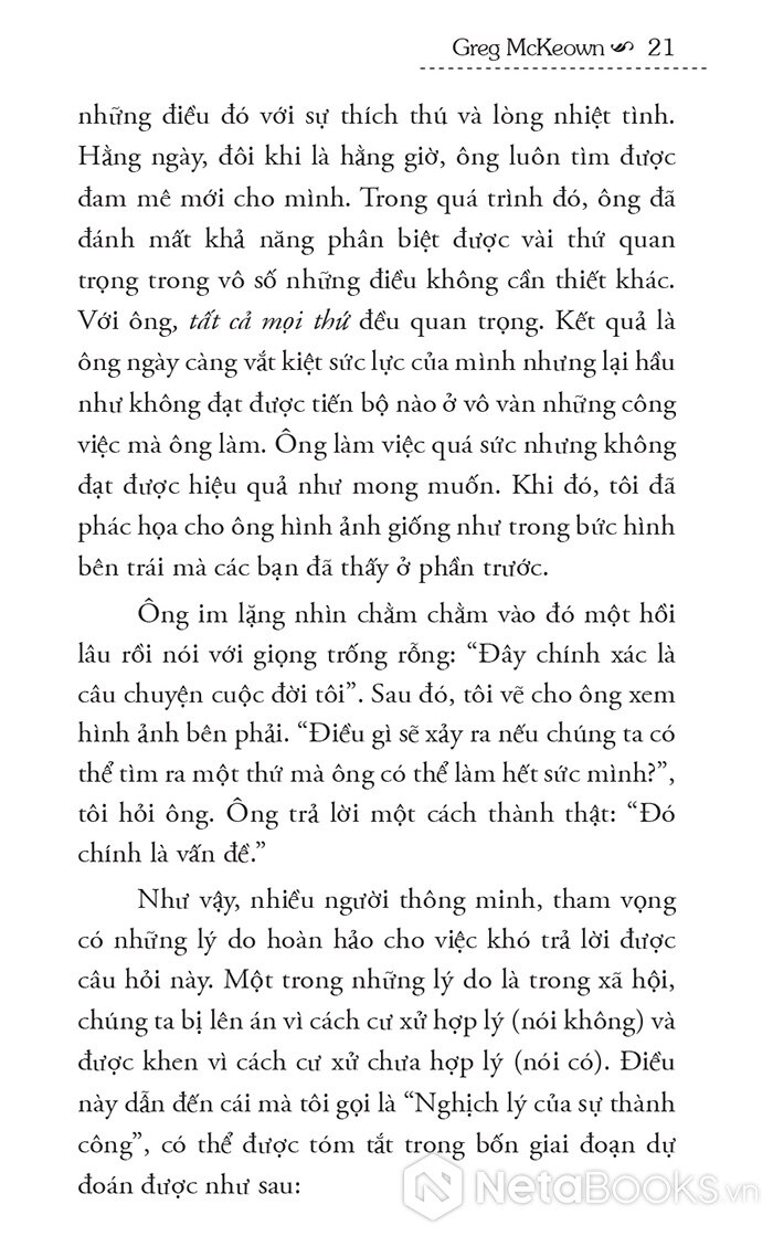 Greg kể rất nhiều câu chuyện về những người nói “Có” với các câu hỏi trên, từ những nhân viên bình thường đến nhà lãnh đạo của các công ty lớn, đặc biệt là lớp người thứ hai. Họ là nô lệ của chiếc điện thoại, tài liệu chồng chất, những cuộc họp vô nghĩa hàng tuần, những cuộc hẹn mà họ biết rằng không đem lại điều gì,… Tóm lại, điểm chung của họ là không ngừng cố gắng, làm việc nhiều hơn, nhiều hơn nữa nhưng kết quả thì vẫn không thể tiến thêm bước nào. Điều tồi tệ nhất chính là họ không hề cảm thấy hạnh phúc khi không còn thời gian cho những điều thực sự quan trọng trong cuộc đời và thời gian cho chính bản thân mình.