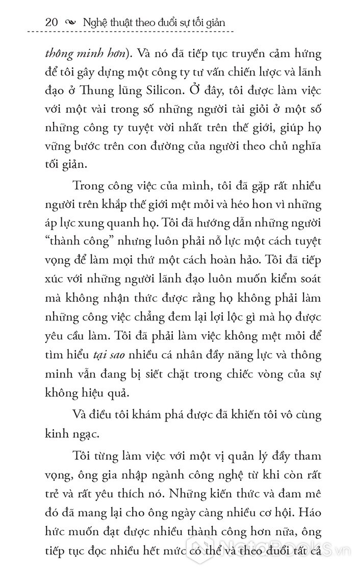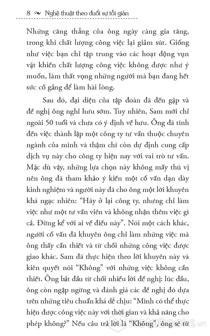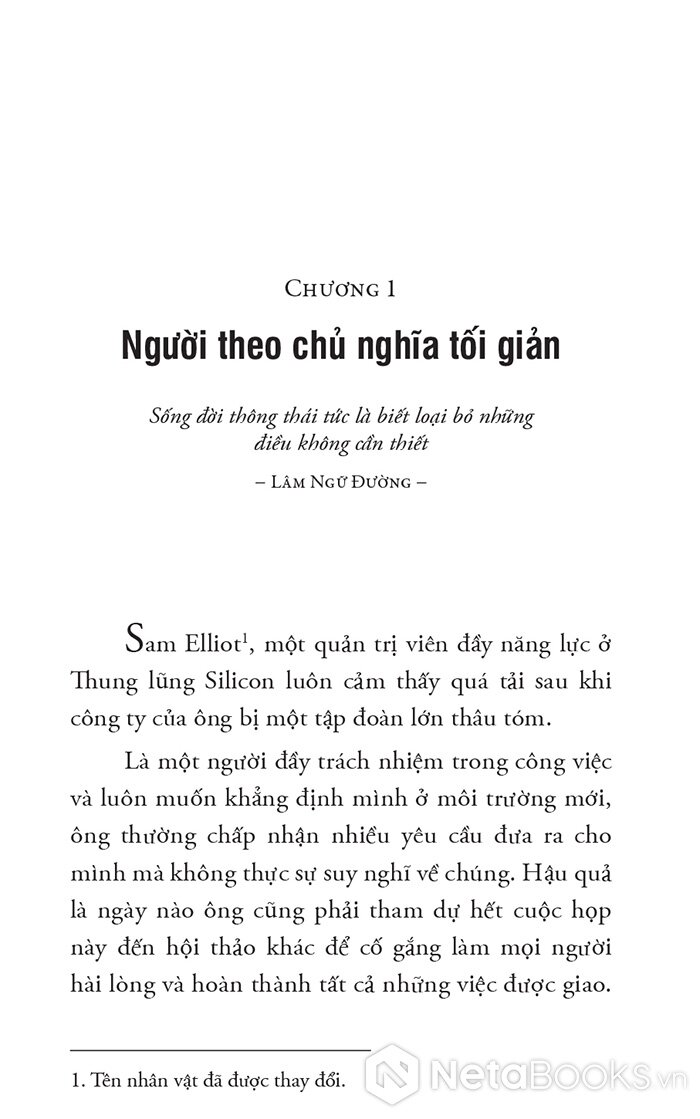 Tại sao lại cần tối giản? “Bạn đã bao giờ cảm thấy quá tải? Bạn đã bao giờ cảm thấy mình tuy làm việc hết sức nhưng không được trọng dụng? Bạn đã bao giờ thấy mình chỉ tập trung vào các việc nhỏ nhặt? Bạn đã bao giờ cảm thấy mình luôn bận rộn nhưng lại không đạt được hiệu quả? Giống như việc bạn luôn di chuyển nhưng chẳng đi được đến đâu cả?”