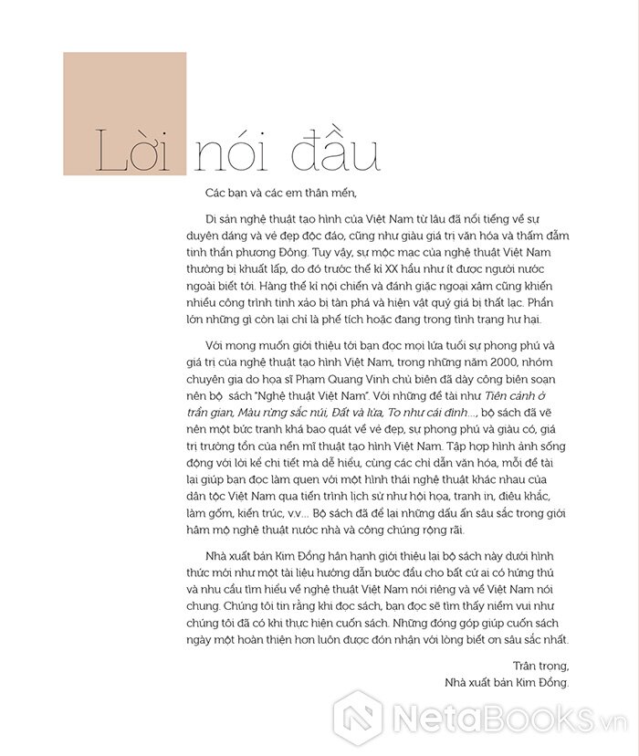 Cuốn sách Nghệ Thuật Việt Nam được Nhà xuất bản Kim Đồng giới thiệu lại dưới một hình thức mới, góp phần làm phong phú thêm kho tàng tài liệu hướng dẫn bước đầu cho bất cứ ai có hứng thú và nhu cầu tìm hiểu về nghệ thuật Việt Nam nói riêng và về Việt Nam nói chung.