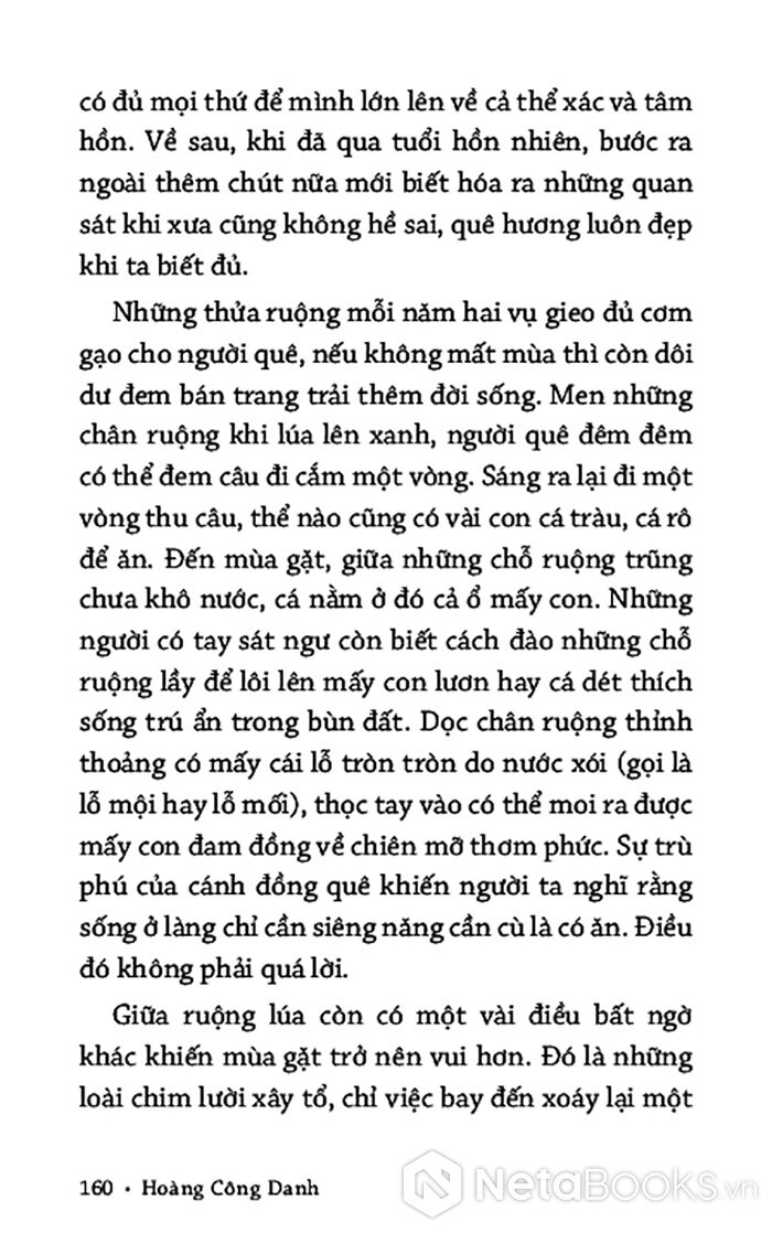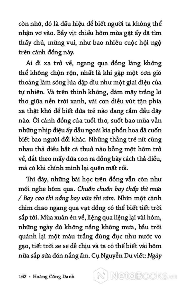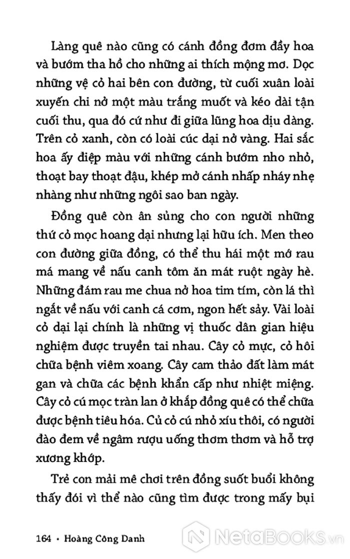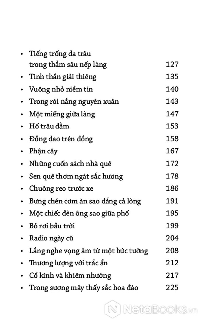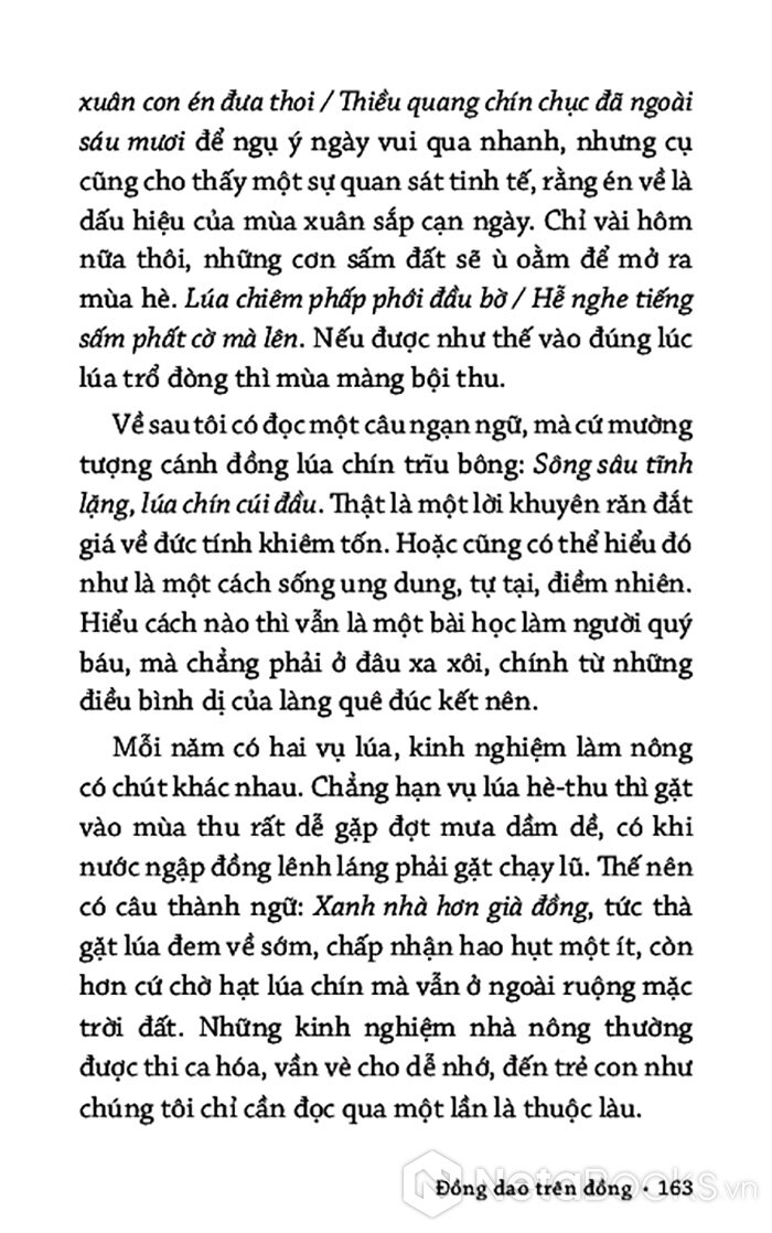 Từ khu vườn xuân, tác giả dẫn bạn đọc đi qua cánh đồng mùa hạ, những đêm trăng mùa thu, rồi đến mùa đông dầm dề mưa lụt. Phong tục tập quán, nếp sống dân gian hiện lên chân thật tạo thành một dòng mạch liên tưởng, vừa riêng vừa chung, nơi tác giả đồng cảm và hòa mình vào số phận của vùng đất, con người.