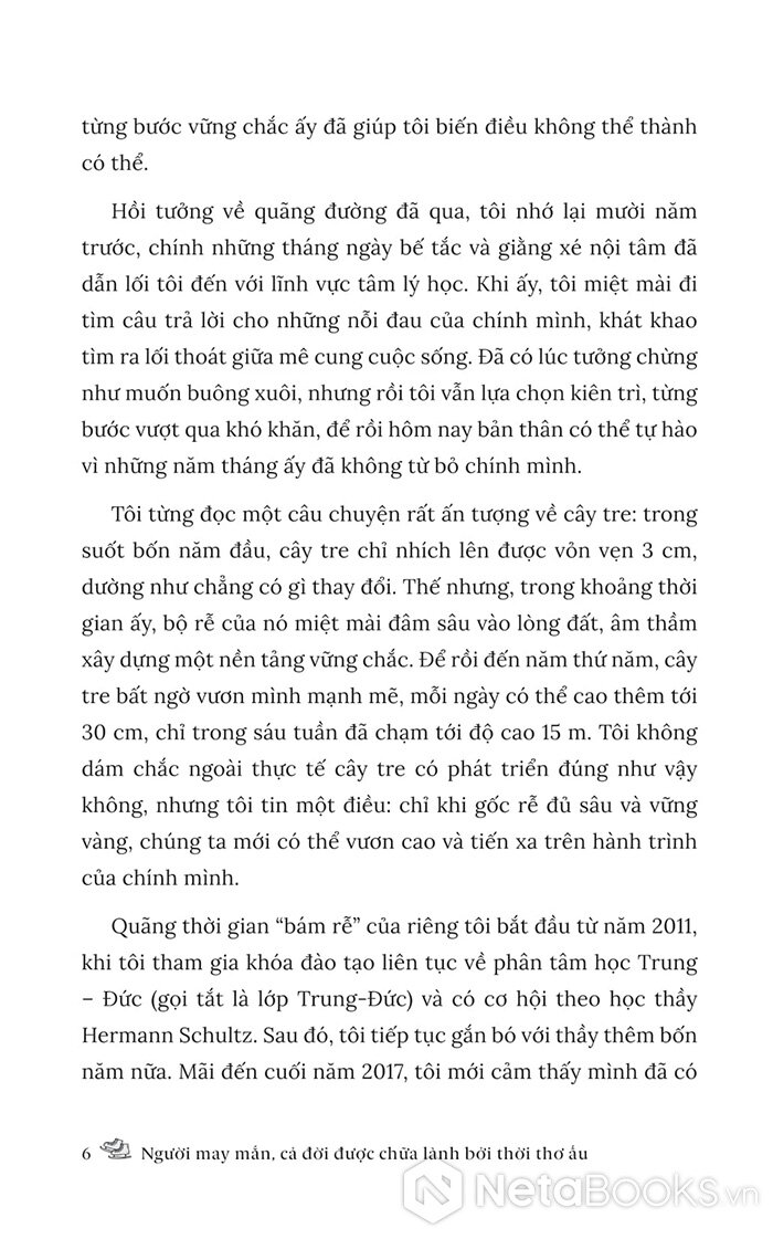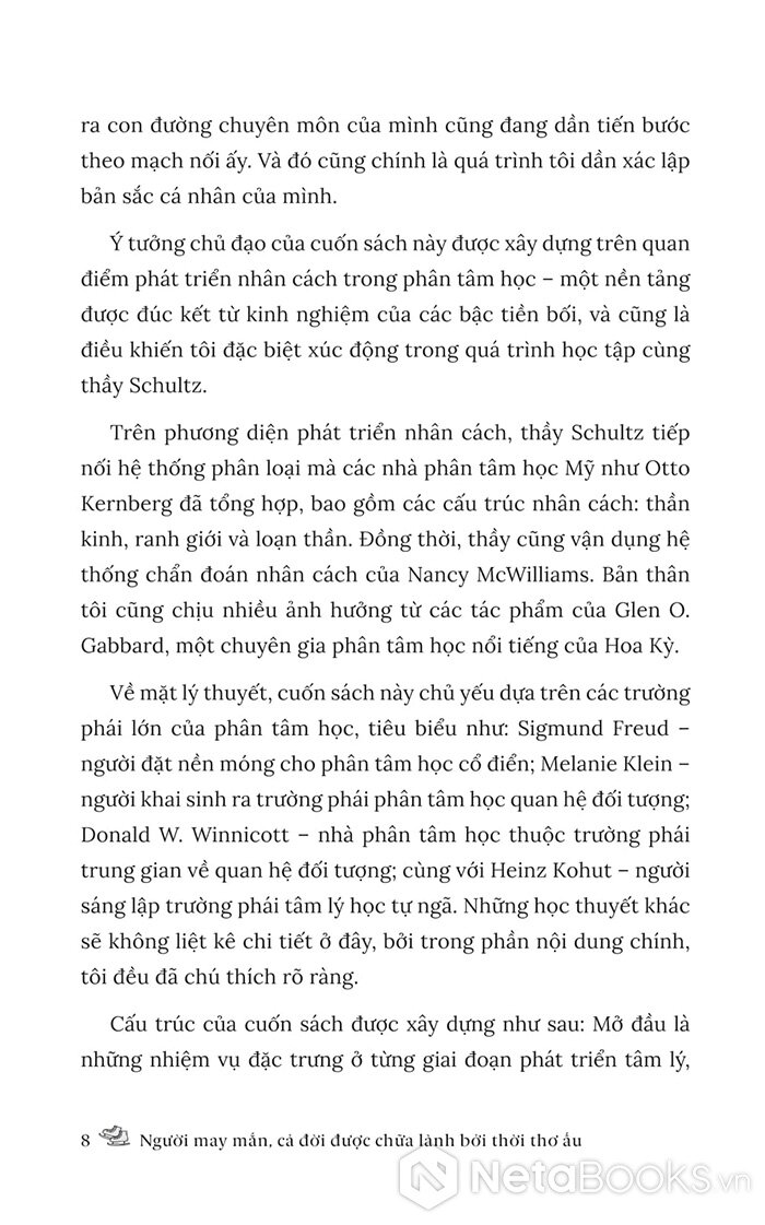Người may mắn, cả đời được chữa lành bởi thời thơ ấu là hành trình trở về với những năm tháng đầu tiên của tâm hồn nơi mọi niềm tin và nỗi đau hình thành. Dưới góc nhìn của phân tâm học và sự thấu cảm của một người từng đi qua đổ vỡ, tác giả Vương Hiểu Diễm đưa người đọc đi qua từng giai đoạn phát triển tâm lý của con người - từ giai đoạn sơ sinh đến khi trưởng thành - để lý giải vì sao những tổn thương trong tuổi thơ lại ảnh hưởng sâu sắc đến cảm xúc, các mối quan hệ và cách ta nhìn nhận bản thân khi lớn lên. Từ đó, tác giả còn chỉ ra con đường chữa lành nội tâm: chấp nhận, cảm thông và tái kết nối với “đứa trẻ bên trong” mỗi người