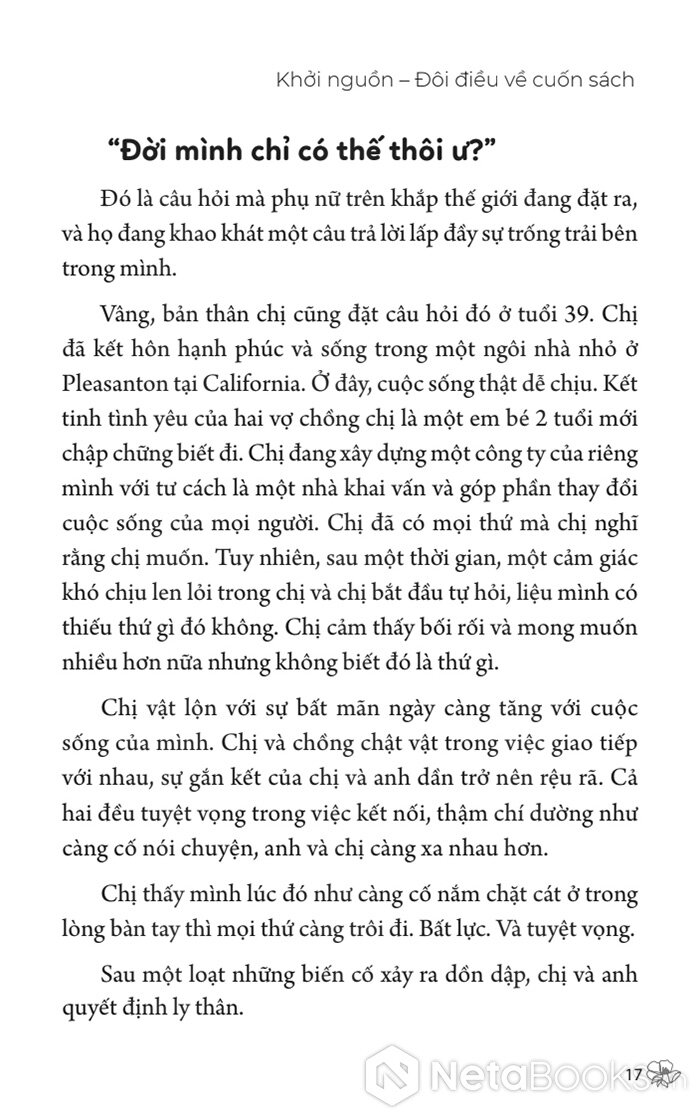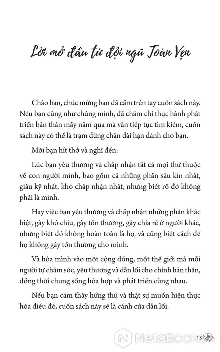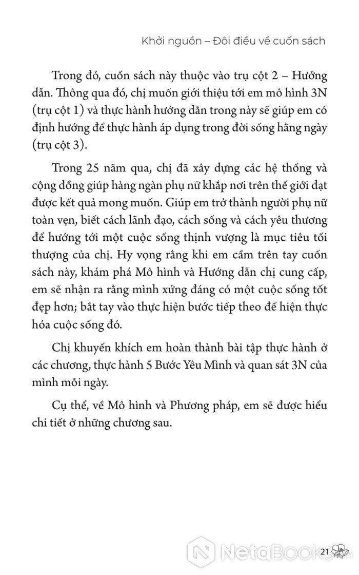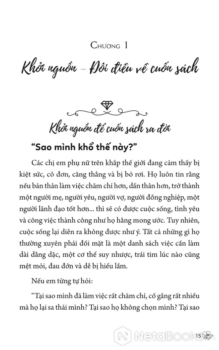 Cuốn sách này không hứa sẽ chữa lành bạn, cũng không biến bạn thành người hoàn hảo. Nhưng nó sẽ chỉ cho bạn một cách sống khác: yêu chính mình một cách toàn vẹn, để từ đó có được tình yêu, gia đình, sự nghiệp, và cả bản thân - theo cách MÌNH muốn, không phải hy sinh mù quáng, không phải gồng gánh, cũng như không phải đợi được "cho phép".
