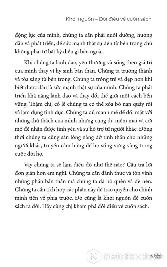 Vậy chúng ta sẽ làm điều đó như thế nào? Câu trả lời đơn giản hơn em nghĩ. Chúng ta cần đánh thức và tôn vinh những phần bản thân mà chúng ta đã bỏ quên và đè nén. Chúng ta cần tích hợp các phần này để trao quyền cho chính mình tiến về phía trước. Đó cũng là khởi nguồn để cuốn sách ra đời.