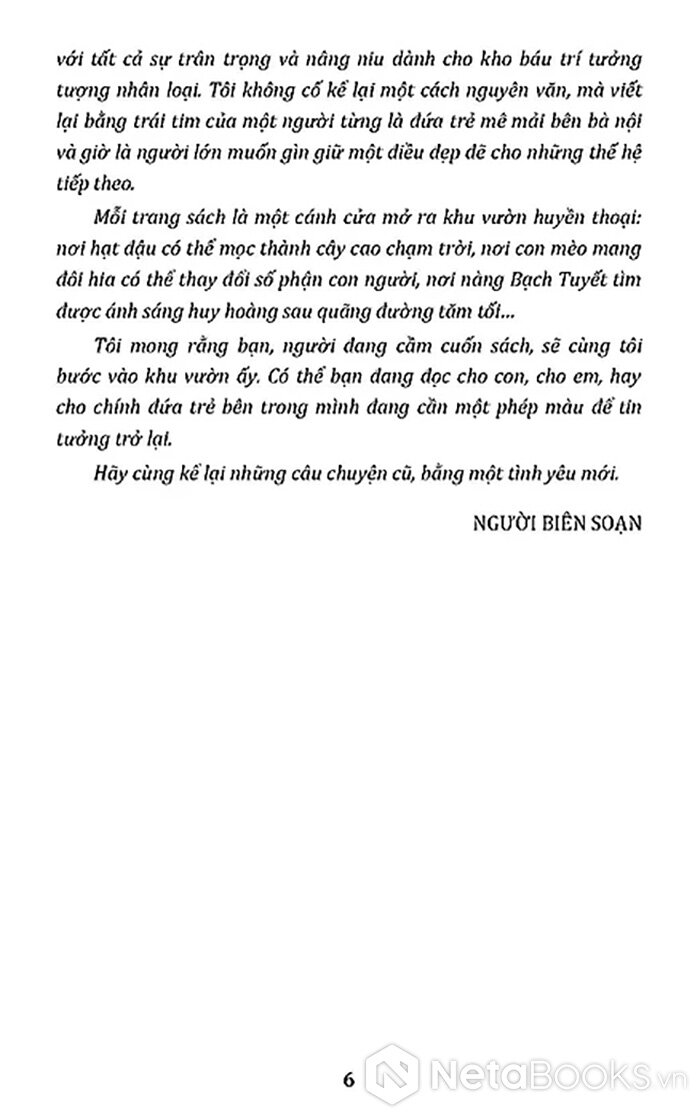 Tuyển chọn những câu chuyện cổ tích nổi tiếng thế giới mang nhiều ý nghĩa giáo dục sâu sắc, giúp các bạn nhỏ phát triển ngôn ngữ, trí tưởng tượng, khả năng tư duy và hình thành nhân cách tốt đẹp thông qua các bài học về tình yêu thương, lòng dũng cảm, trung thực, gieo vào tâm hồn trẻ thơ niềm tin vào cái thiện, vào phép màu của lòng nhân hậu và ước mơ được bay xa…
