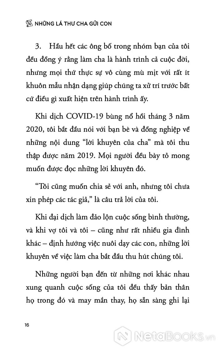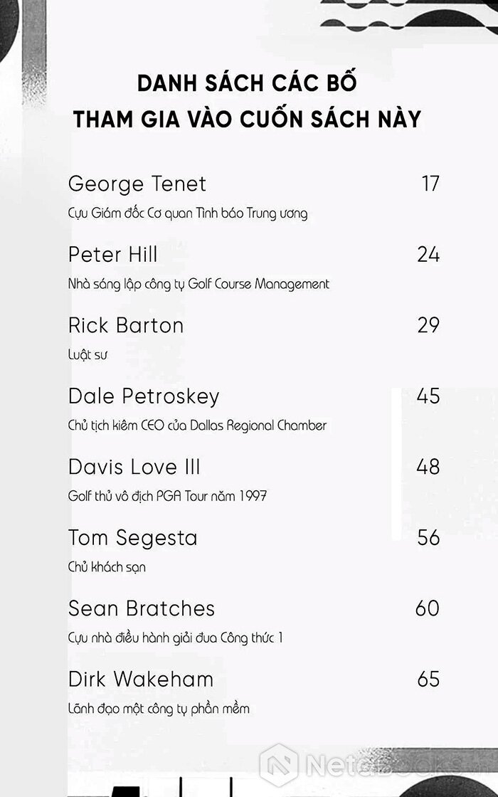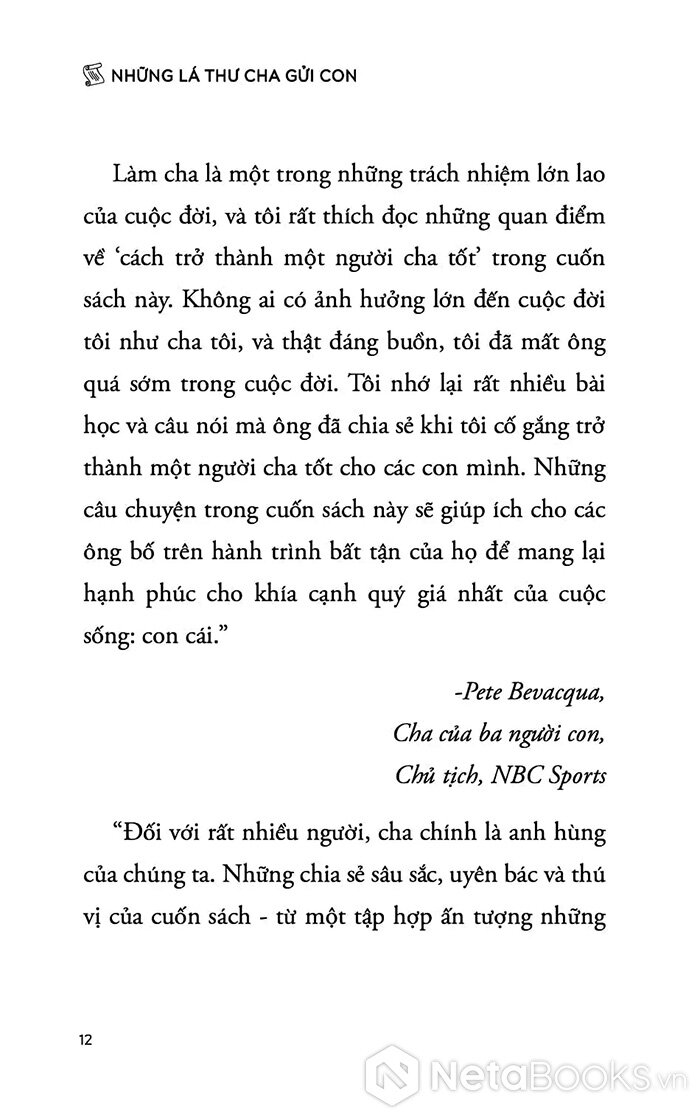Tập hợp hơn 40 lá thư và bài sẻ chia từ các người cha trên khắp tầng lớp xã hội: doanh nhân, luật sư, lãnh đạo, bác sĩ, vận động viên, nhà điều hành cấp cao. Cuốn sách mở ra một cái nhìn đa chiều, thực tế và chân thành về hành trình nuôi dưỡng một con người trưởng thành.