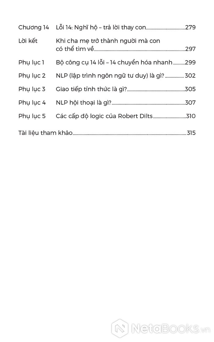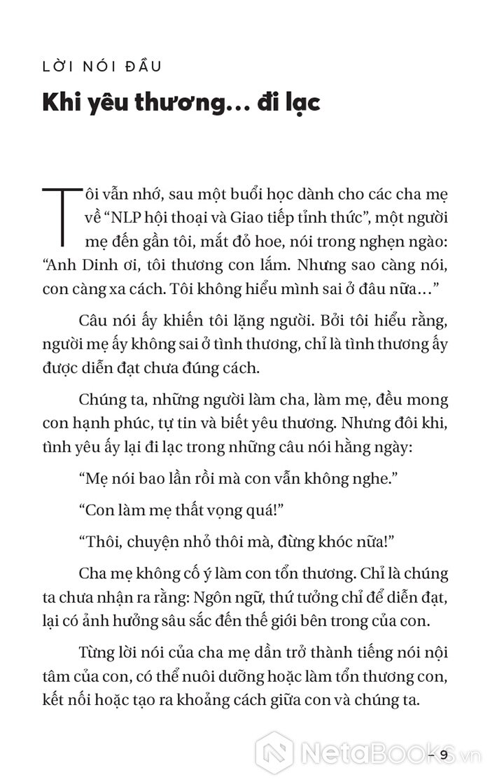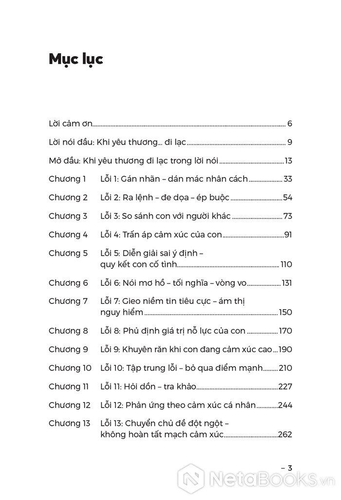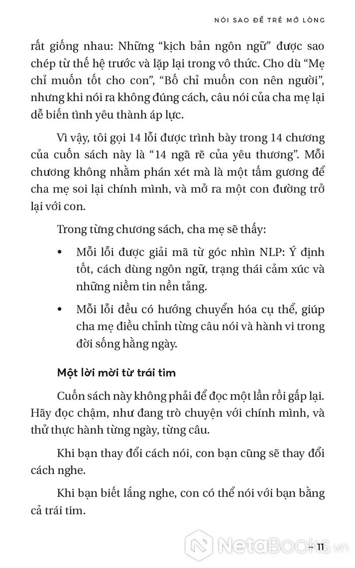 - Phân tích 14 lỗi giao tiếp phổ biến: Mỗi chương là một lộ trình từ nhận diện lời nói gây tổn thương (gán nhãn, quy kết động cơ, trấn áp cảm xúc...) đến việc giải mã ý định tốt và phân tích tác động tâm lý lên trẻ.