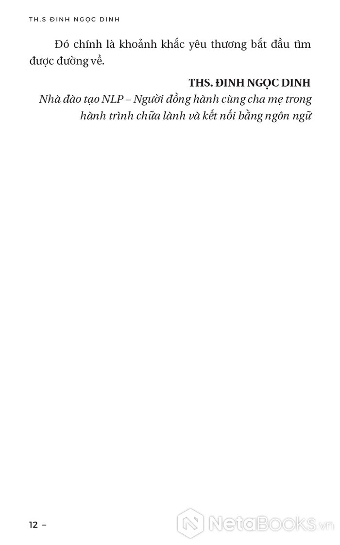 ThS. Đinh Ngọc Dinh là nhà đào tạo NLP thuộc Hội đồng ABNLP Hoa Kỳ và là người sáng lập Sun NLP Training & Coaching. Ông là chuyên gia phát triển Hệ thống giao tiếp tỉnh thức và NLP hội thoại tại Việt Nam. Với tâm niệm "khi cha mẹ thay đổi cách nói, con sẽ thay đổi cách cảm nhận chính mình", ông đã đồng hành và giúp đỡ hàng nghìn phụ huynh chuyển hóa mối quan hệ gia đình thông qua những thay đổi nhỏ nhưng sâu sắc trong ngôn ngữ hằng ngày.