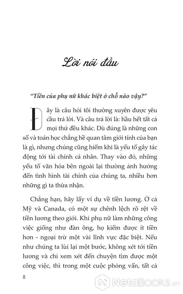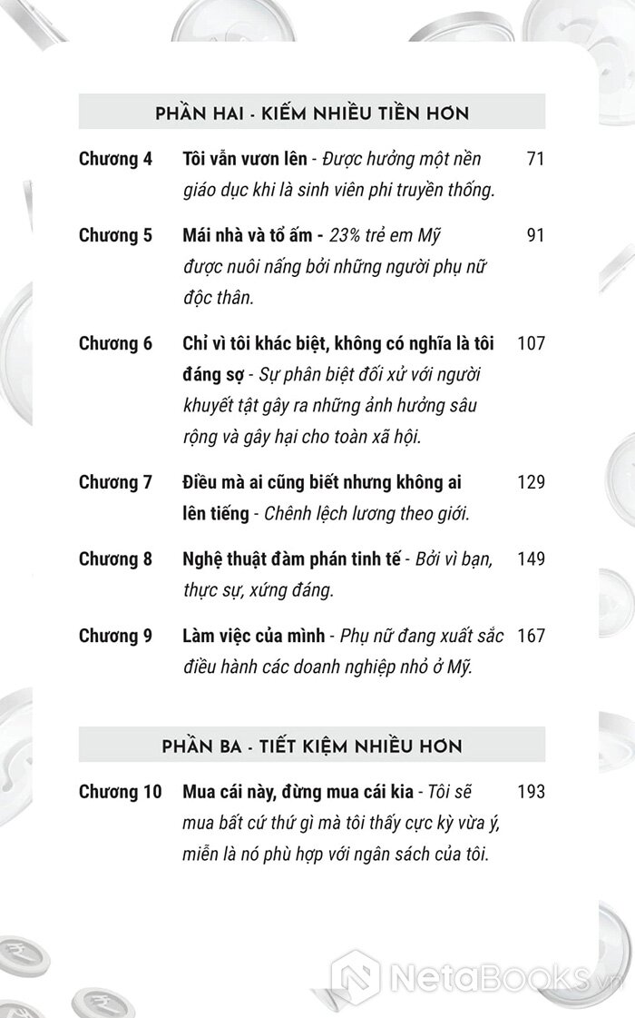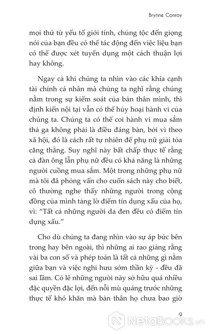 Cuốn sách này tập trung khai thác một sự thật ít được nhìn nhận thẳng thắn, rằng tiền bạc của phụ nữ chịu ảnh hưởng lớn bởi định kiến xã hội, vai trò giới, và những áp lực mang tính hệ thống. Từ việc phụ nữ bị trả lương thấp hơn, gặp bất công trong đàm phán, cho đến bị định hình bởi những quan niệm cũ kỹ về “người mẹ hoàn hảo” hay “nữ siêu nhân”, Brynne Conroy đã bóc tách những tầng lớp cấu thành nên sự bất bình đẳng kinh tế hiện đại. Cô không né tránh thực tế, mà đối mặt và viết lại một định nghĩa mới về “thịnh vượng”, không chỉ là tài sản, mà là tự chủ, sức khỏe tinh thần, kết nối xã hội và cảm giác hài lòng với chính mình.