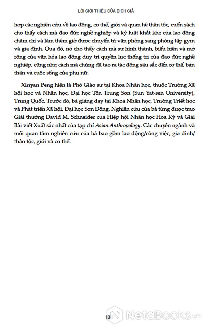Dựa trên 18 tháng thực địa (2015-2018) tại Thượng Hải, tác giả đưa người đọc bước vào ba không gian sống tiêu biểu của phụ nữ văn phòng: nơi làm việc, phòng tập thể hình và gia đình. Thông qua việc tích hợp các nghiên cứu về lao động, giới, cơ thể và quan hệ thân tộc, cuốn sách phân tích cách các ý tưởng và thực hành xã hội đang tái cấu trúc cơ thể, bản thể và đời sống gia đình của phụ nữ đương đại.
