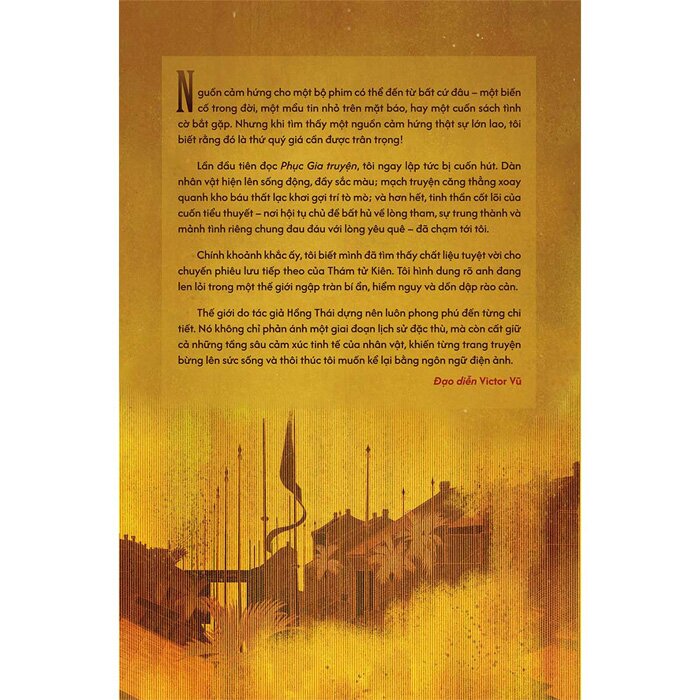 “Nguồn cảm hứng cho một bộ phim có thể đến từ bất cứ đâu - một biến cố trong đời, một mẩu tin nhỏ trên mặt báo, hay một cuốn sách tình cờ bắt gặp. Nhưng khi tìm thấy một nguồn cảm hứng thật sự lớn lao, tôi biết rằng đó là thứ quý giá cần được trân trọng! Lần đầu tiên đọc Phục Gia truyện, tôi ngay lập tức bị cuốn hút. Dàn nhân vật hiện lên sống động, đầy sắc màu; mạch truyện căng thẳng xoay quanh kho báu thất lạc khơi gợi trí tò mò; và hơn hết, tinh thần cốt lõi của cuốn tiểu thuyết - nơi hội tụ chủ đề bất hủ về lòng tham, sự trung thành và mảnh tình riêng chung đau đáu với lòng yêu quê - đã chạm tới tôi. Chính khoảnh khắc ấy, tôi biết mình đã tìm thấy chất liệu tuyệt vời cho chuyến phiêu lưu tiếp theo của Thám tử Kiên. Tôi hình dung rõ anh đang len lỏi trong một thế giới ngập tràn bí ẩn, hiểm nguy và dồn dập rào cản. Thế giới do tác giả Hồng Thái dựng nên luôn phong phú đến từng chi tiết. Nó không chỉ phản ánh một giai đoạn lịch sử đặc thù, mà còn cất giữ cả những tầng sâu cảm xúc tinh tế của nhân vật, khiến từng trang truyện bừng lên sức sống và thôi thúc tôi muốn kể lại bằng ngôn ngữ điện ảnh.” - Đạo diễn Victor Vũ