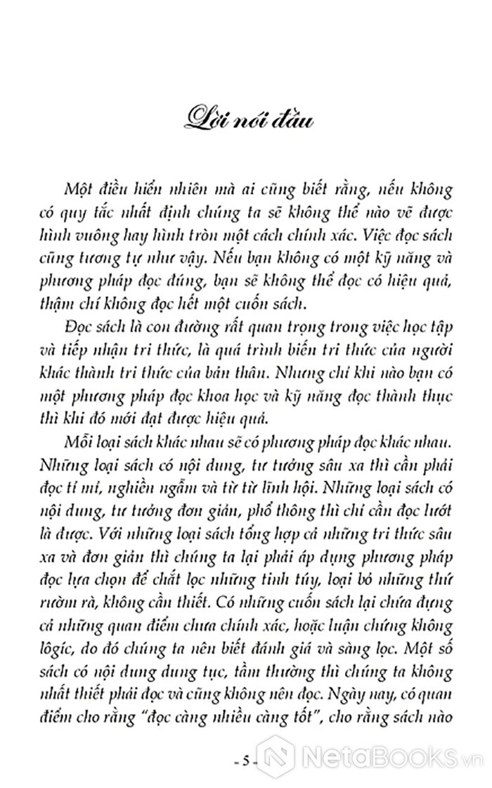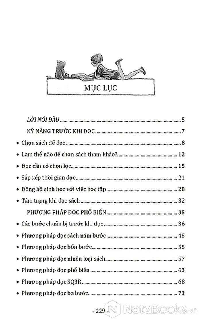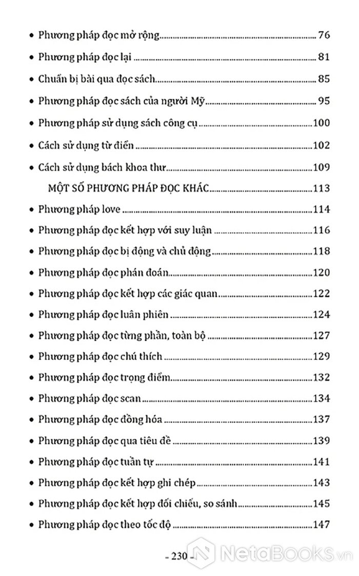 Giới thiệu các kĩ năng trước khi đọc sách, các phương pháp đọc sách: các bước chuẩn bị trước khi đọc, phương pháp đọc sách năm bước, phương pháp đọc bốn bước, phương pháp đọc nhiều loại sách...