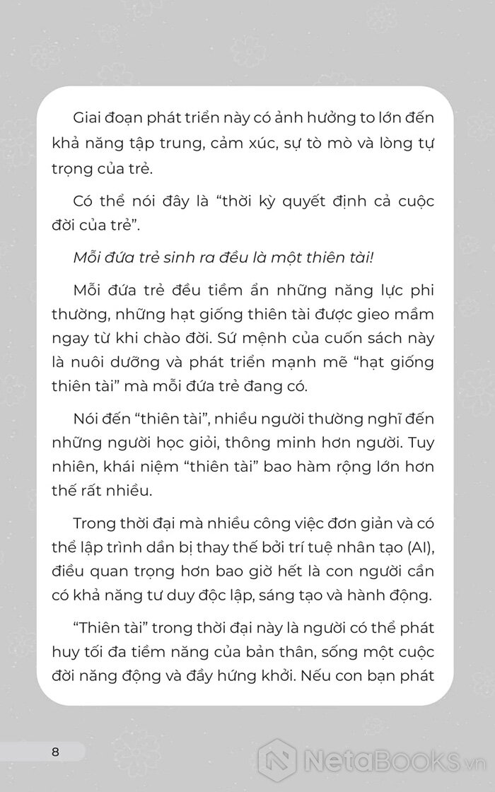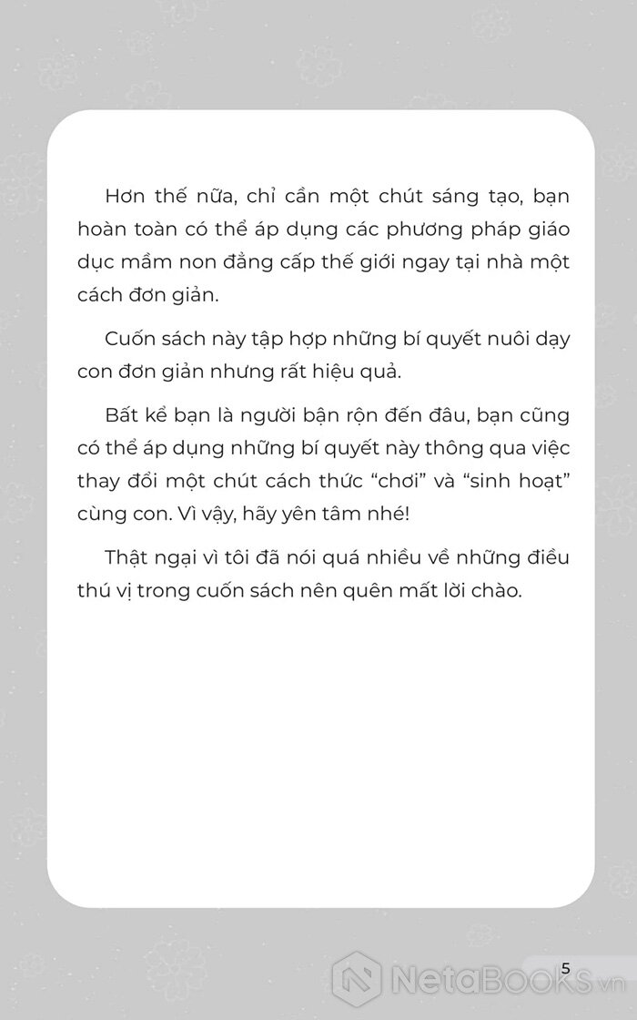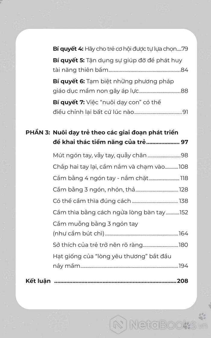 Không chỉ dừng lại ở việc chia sẻ kiến thức, cuốn sách còn đưa ra nhiều hoạt động và bí quyết thực tế để cha mẹ bắt tay vào thực hiện ngay lập tức. Đó là cách quan sát tinh tế để nhận ra sở thích và giai đoạn nhạy cảm của con; cách biến trò chơi với nước, cát hay đồ vật trong nhà thành bài học; cách tạo dựng một môi trường sống được sắp xếp khoa học, khuyến khích sự tự chủ; hay cách để trẻ tham gia vào những công việc gia đình như một trò chơi thú vị, từ đó học được tính trách nhiệm và sự khéo léo.