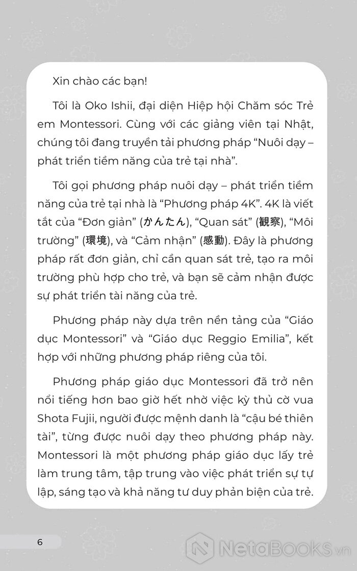 Cuốn sách Phương pháp giáo dục Montessori và Reggio Emilia cho trẻ 0-6 của tác giả Oko Ishii được xem như một cẩm nang toàn diện dành cho cha mẹ trong giai đoạn nuôi dạy con từ sơ sinh đến khi trẻ bước vào tiểu học. Không chỉ dừng lại ở lý thuyết, cuốn sách còn mang đến những hướng dẫn thực tiễn, dễ áp dụng trong đời sống thường ngày, ngay cả với những phụ huynh bận rộn nhất.
