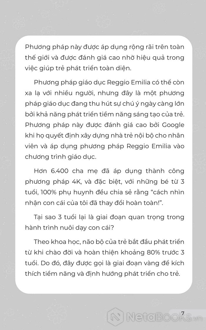 Điểm đặc biệt khiến cuốn sách này nổi bật chính là việc tác giả đã kết hợp thành công hai phương pháp giáo dục tưởng chừng đối lập: Montessori và Reggio Emilia. Nếu Montessori tập trung vào sự kỷ luật, trật tự và tính tự lập thông qua những hoạt động có cấu trúc rõ ràng, thì Reggio Emilia lại nhấn mạnh sự sáng tạo, tính tự do, khả năng khám phá và hợp tác của trẻ. Bằng cách kết hợp cả hai, cuốn sách chỉ ra rằng cha mẹ có thể vừa xây dựng cho con một nền tảng vững chắc, vừa nuôi dưỡng trí tưởng tượng và khả năng sáng tạo - hai yếu tố không thể thiếu để trẻ phát triển toàn diện trong thế kỷ 21.