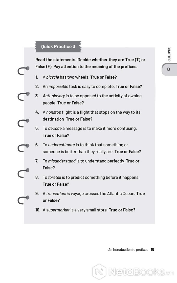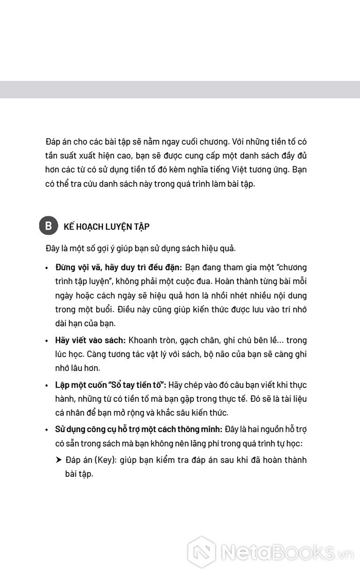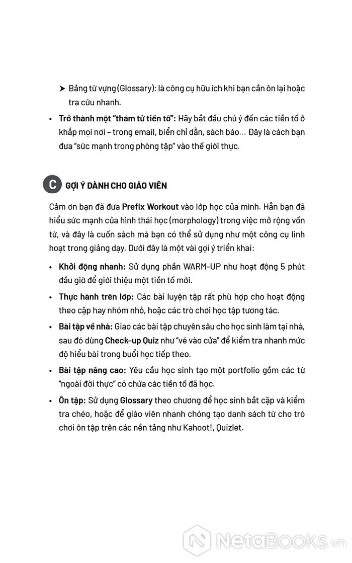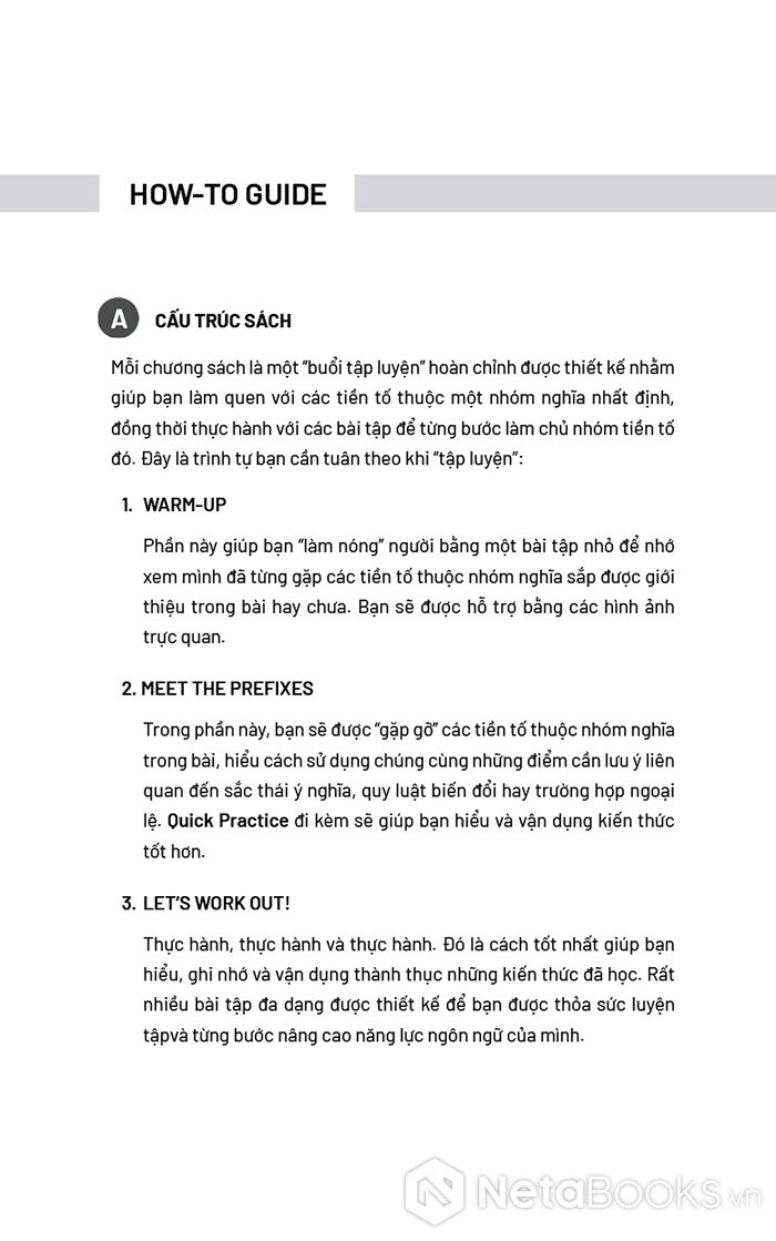 Người học có thể kích hoạt trí nhớ bằng hình ảnh trực quan trong phần Warm-up, sau đó giải mã quy luật của từng nhóm tiền tố trong phần Meet the Prefixes, và cuối cùng áp dụng kiến thức thông qua các bài tập trong phần Let’s Work Out.