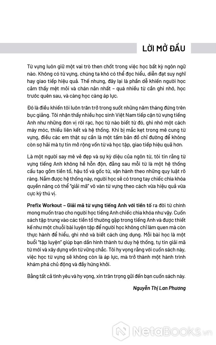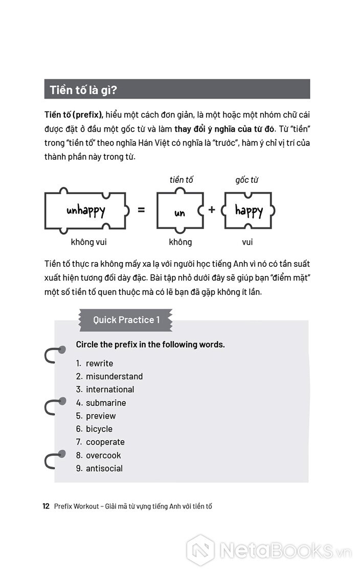Sách Prefix Workout - Giải Mã Từ Vựng Tiếng Anh Với Tiền Tố của tác giả Nguyễn Thị Lan Phương, có bán tại Nhà sách online NetaBooks với ưu đãi Bao sách miễn phí và Gian hàng NetaBooks tại Tiki với ưu đãi Bao sách miễn phí và tặng Bookmark