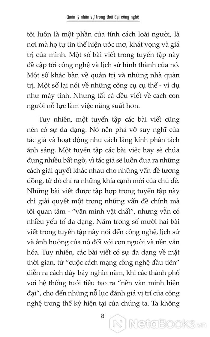 "Quản lý nhân sự trong thời đại công nghệ" là một tuyển tập gồm 12 bài viết kinh điển của Peter F. Drucker - người được xem là “cha đẻ của ngành quản trị hiện đại”. Cuốn sách tập trung làm rõ vai trò then chốt của con người trong một thế giới được định hình lại hoàn toàn bởi công nghệ, đồng thời đặt ra những câu hỏi sâu sắc về bản chất, mục tiêu và trách nhiệm của hoạt động quản trị trong bối cảnh kỹ thuật số.