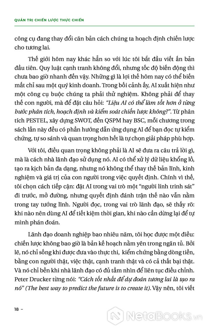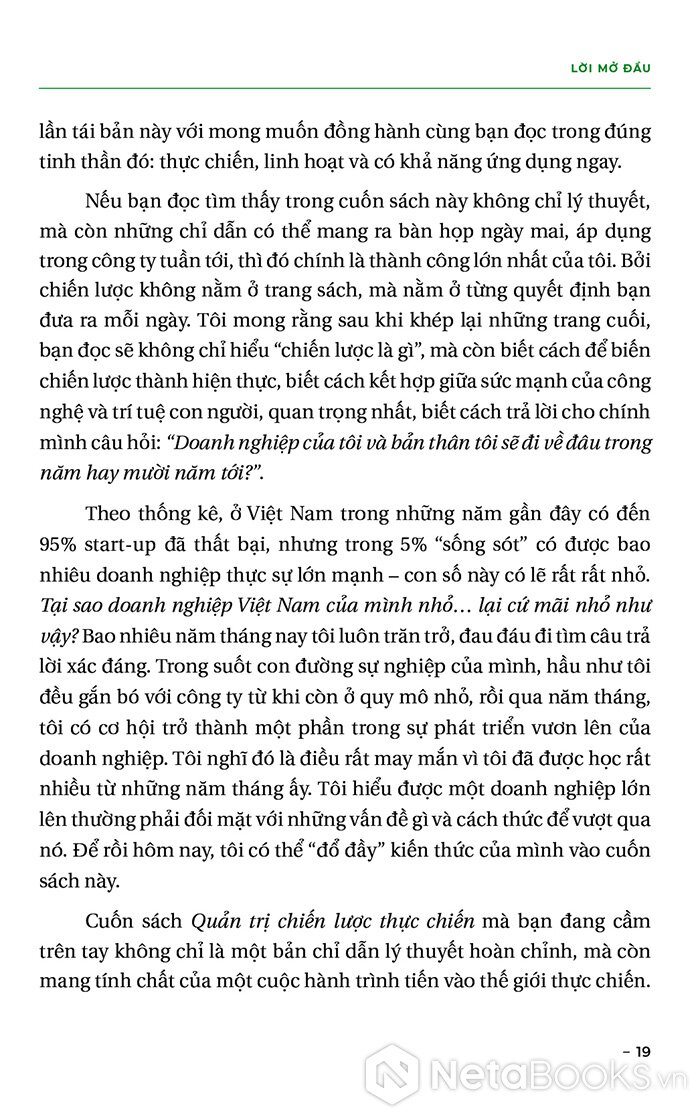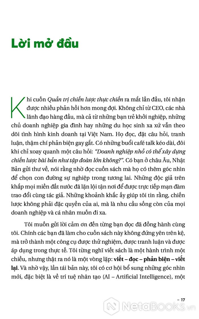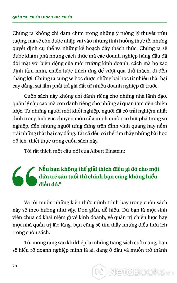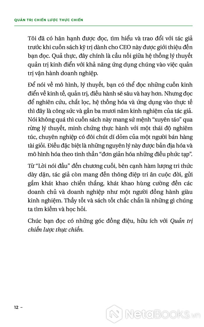 “Cuốn sách Quản trị chiến lược thực chiến mà bạn đang cầm trên tay không chỉ là một bản chỉ dẫn lý thuyết hoàn chỉnh, mà còn mang tính chất của một cuộc hành trình tiến vào thế giới thực chiến. Chúng ta không chỉ đắm chìm trong những ý tưởng lý thuyết trừu tượng, mà sẽ còn được nhập vai vào những tình huống thực tế, những quyết định cụ thể và những kế hoạch đầy thách thức.”