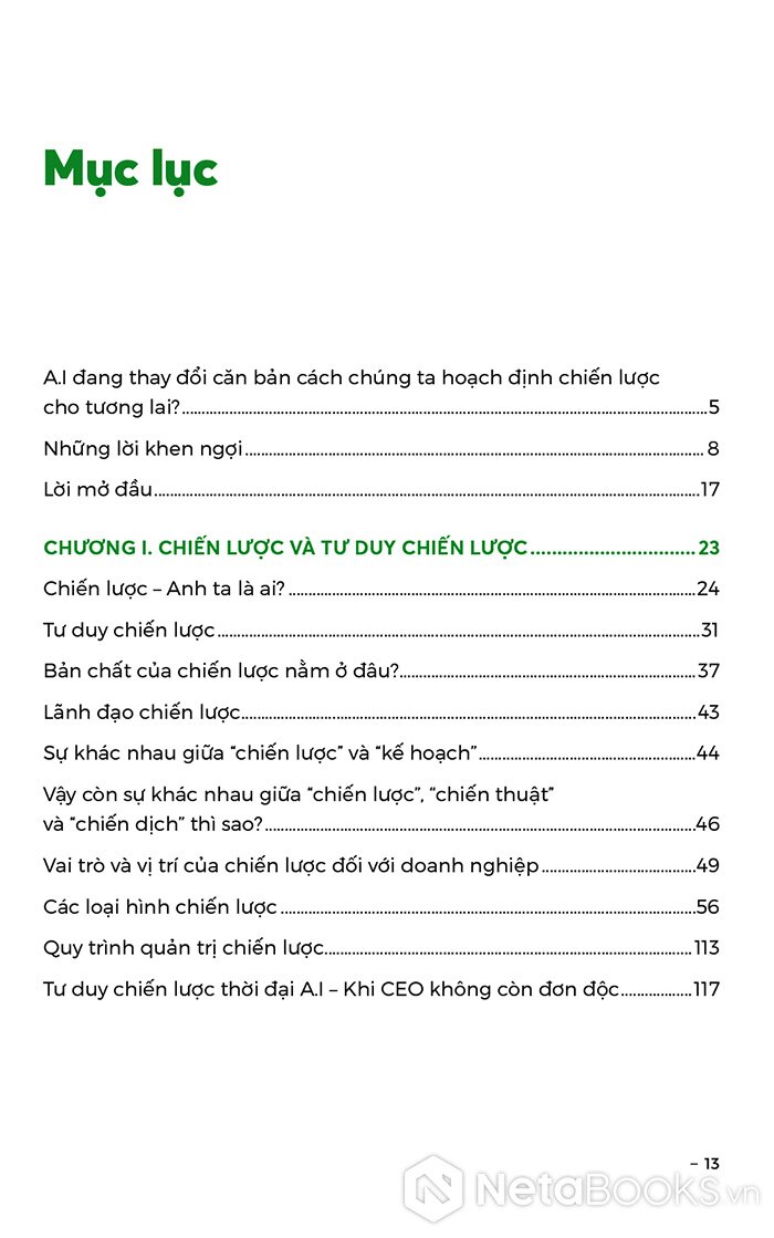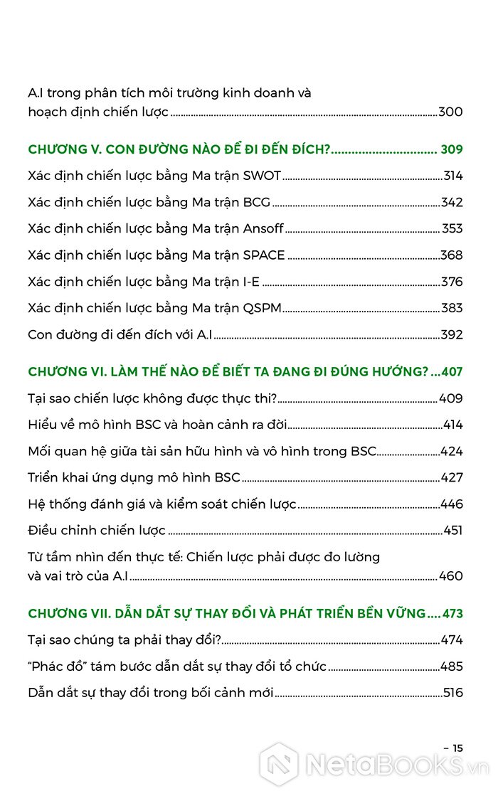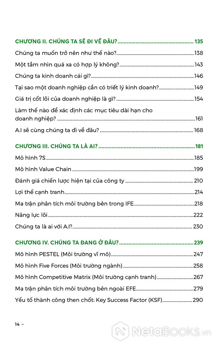 Tác giả dành hai chương đầu sách để giới thiệu lần lượt những khái niệm cơ bản như “chiến lược và tư duy chiến lược”, “tầm nhìn và mục tiêu”, “giá trị cốt lõi”, v.v. đi kèm ví dụ dễ hiểu. Bốn chương tiếp theo đi vào giới thiệu, phân tích và minh họa rất nhiều công cụ hữu ích cho doanh nghiệp và lãnh đạo doanh nghiệp trong việc xây dựng và thực thi chiến lược; có thể kể ra Mô hình Value Chain, Ma trận IFE và EFE, Mô hình PESTEL, Ma trận SWOT, Ma trận ANSOFF… Chương VII cũng là chương cuối cùng có thể được coi là phần mở rộng, nâng cao để người đọc tìm đáp án cho câu hỏi “Tại sao phải thay đổi?”, đồng thời suy ngẫm về việc phát triển bền vững để hướng tới tương lai.
