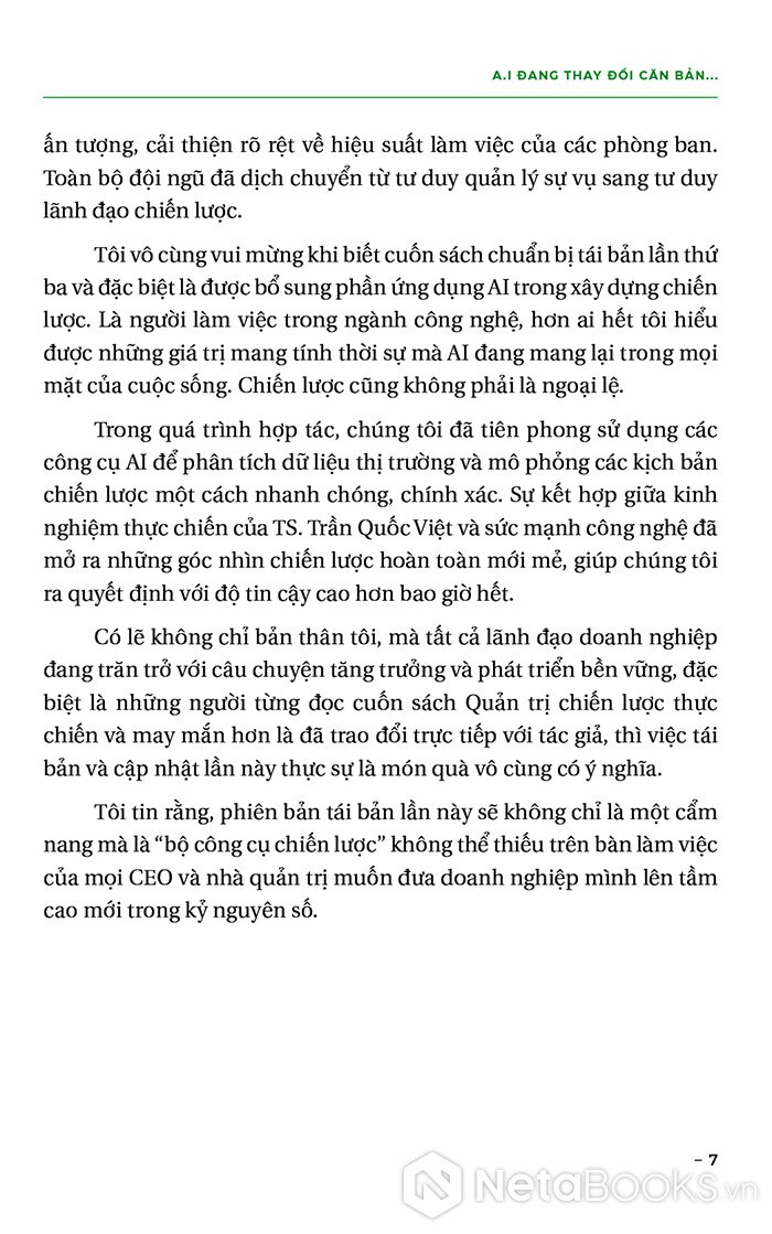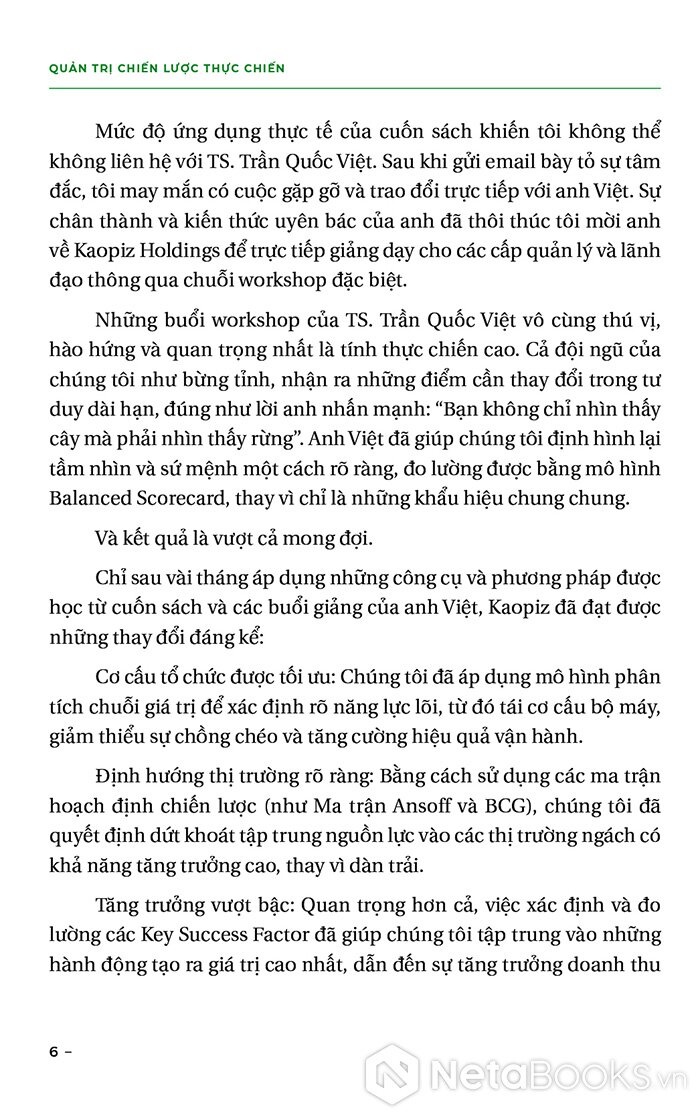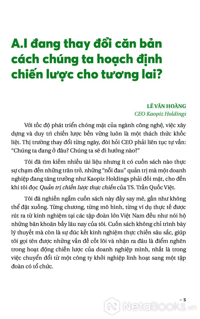 Với nhiều năm kinh nghiệm chinh chiến trên thương trường và bằng lối viết chân phương, TS Trần Quốc Việt đưa người đọc đi khám phá thế giới của quản trị chiến lược “thực chiến” qua nhiều chặng lý thuyết, công cụ và câu chuyện thực tế.