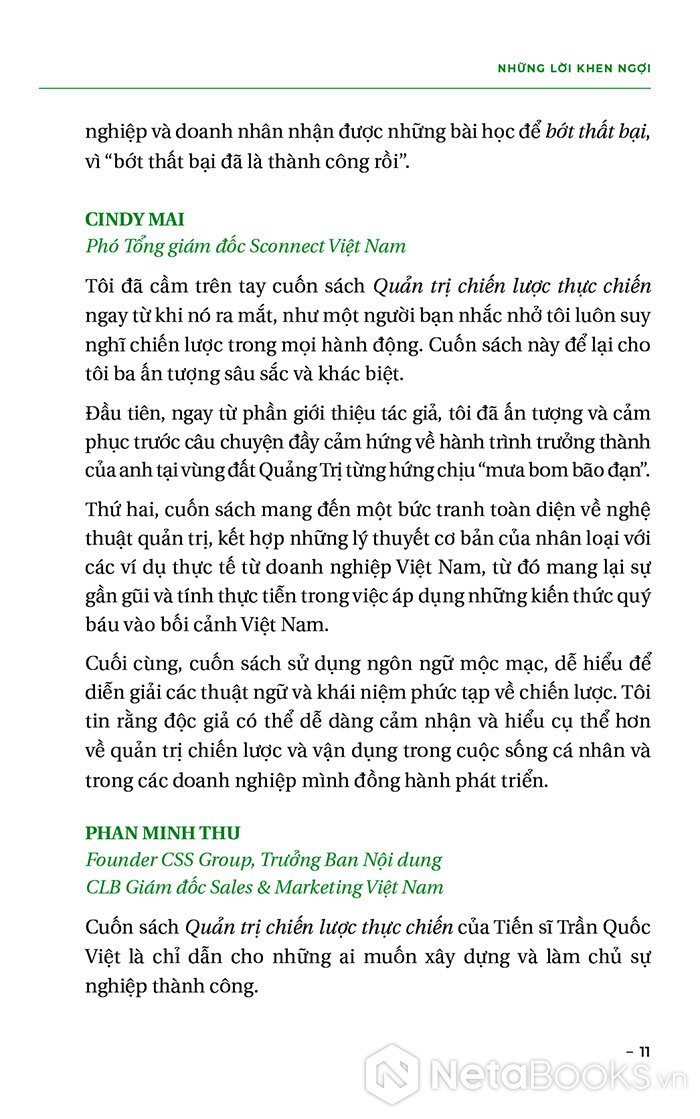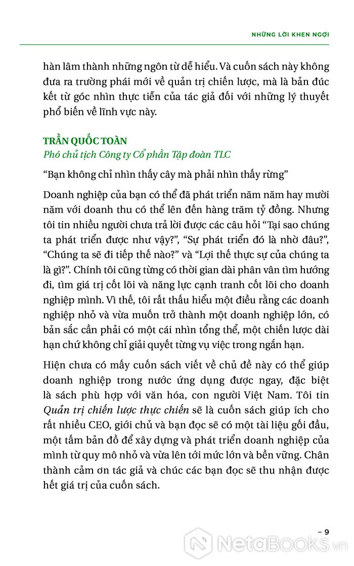 - Đối với chủ đề “quản trị chiến lược”, có thể coi đây là cuốn sách đầy đủ nhất, bài bản nhất do tác giả Việt Nam viết, đặc biệt không mang tính “giáo điều”.