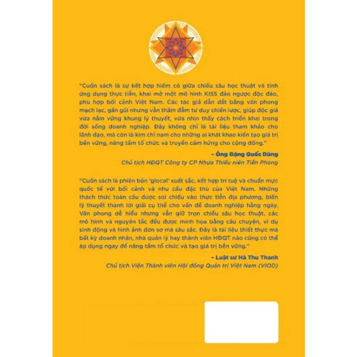 “Cuốn sách là phiên bản ‘glocal’ xuất sắc, kết hợp trí tuệ và chuẩn mực quốc tế với bối cảnh và nhu cầu đặc thù của Việt Nam. Những thách thức toàn cầu được soi chiếu vào thực tiễn địa phương, biến lý thuyết thành lời giải cụ thể cho vấn đề doanh nghiệp hằng ngày. Văn phong dễ hiểu nhưng vẫn giữ trọn chiều sâu học thuật, các mô hình và nguyên tắc đều được minh họa bằng câu chuyện, ví dụ sinh động và hình ảnh đơn sơ mà sâu sắc. Đây là tài liệu thiết thực mà bất kỳ doanh nhân, nhà quản lý hay thành viên HĐQT nào cũng có thể áp dụng ngay để nâng tầm tổ chức và tạo giá trị bền vững.” - Luật sư Hà Thu Thanh, Chủ tịch Viện Thành viên Hội đồng Quản trị Việt Nam (VIOD)