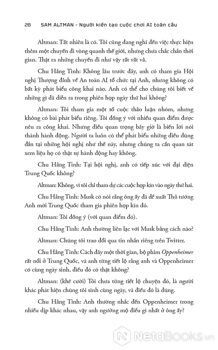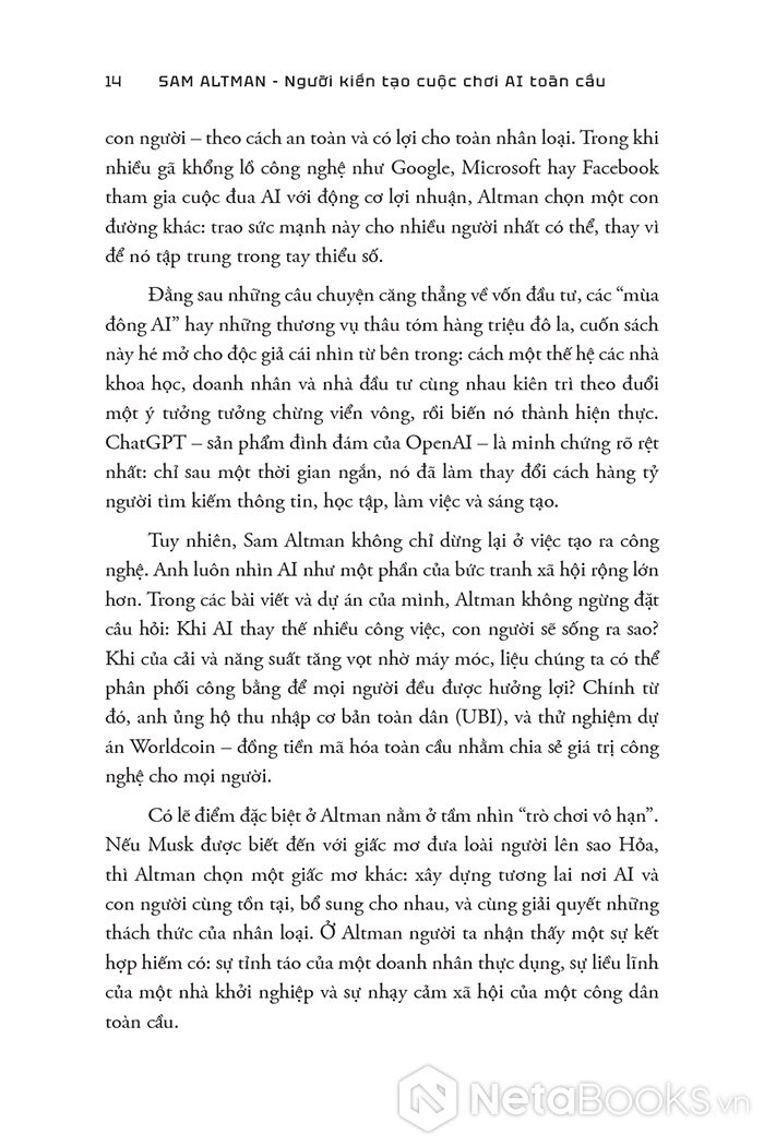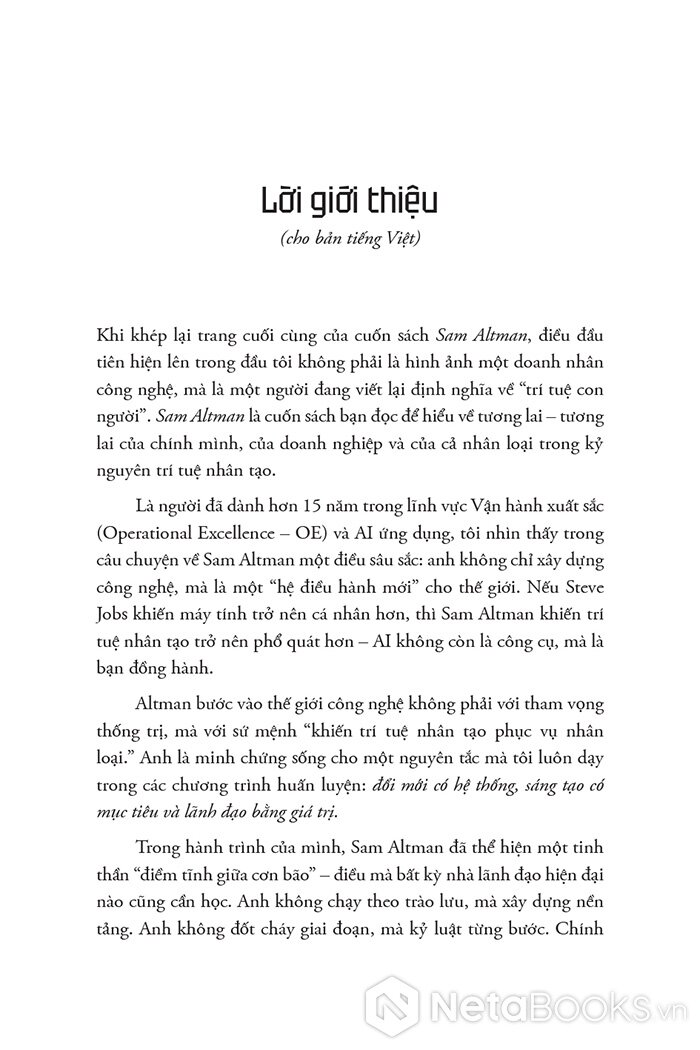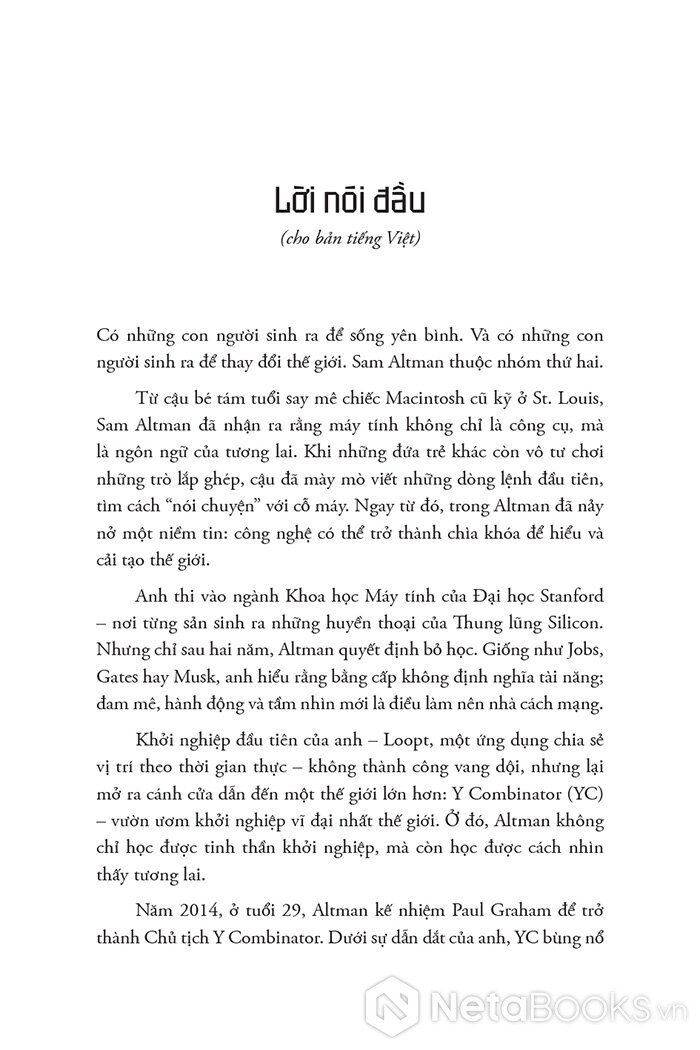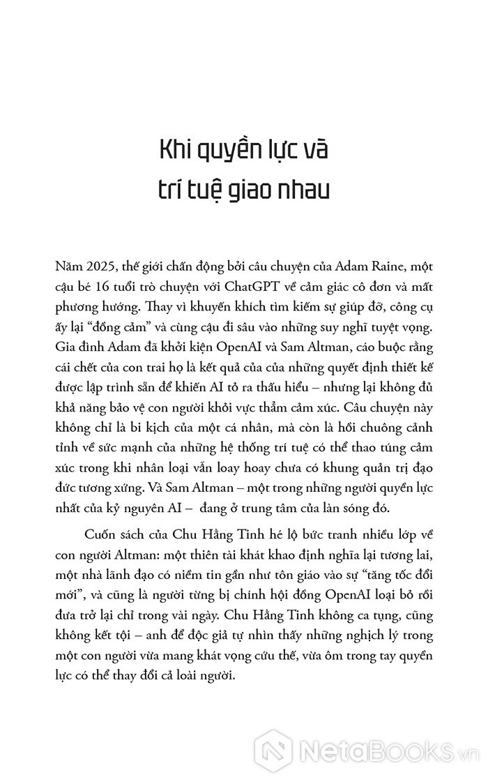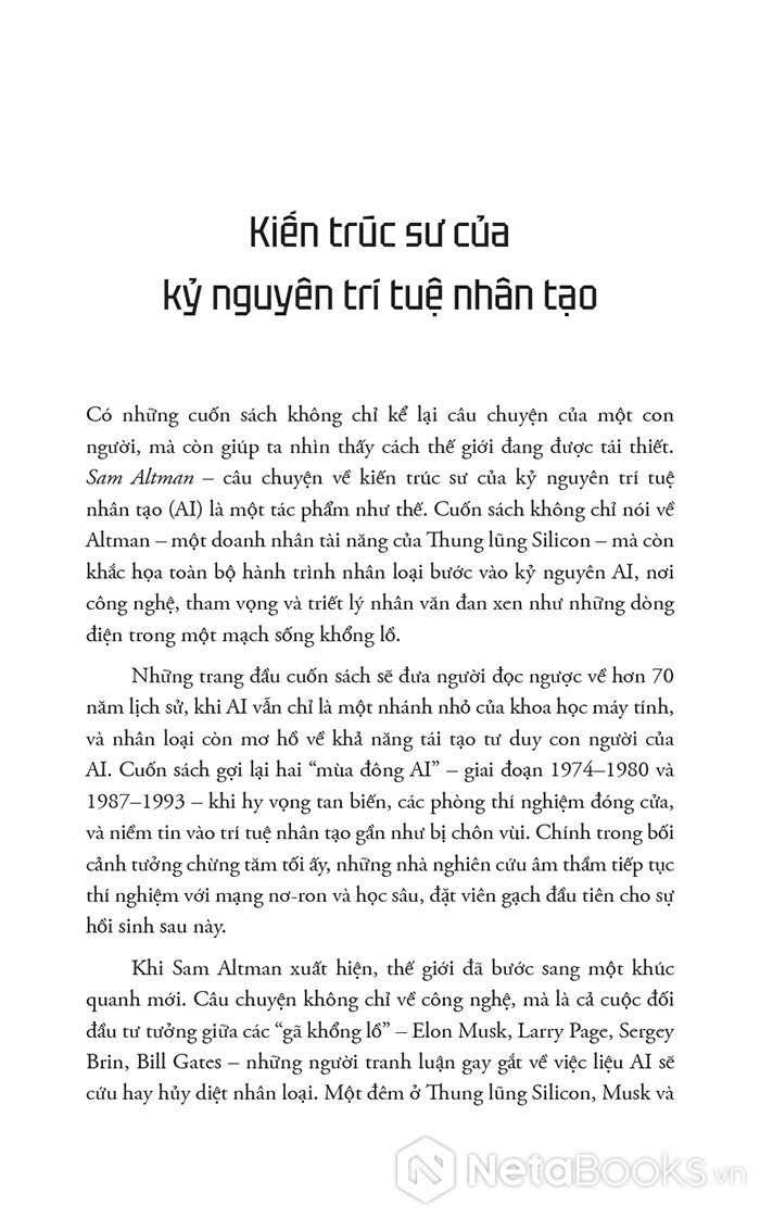 Dựa trên gần một thập kỷ tiếp xúc và nghiên cứu trực tiếp, tác giả đưa người đọc bước vào hành trình khám phá một Sam Altman ngoài đời thực - không chỉ là biểu tượng công nghệ, mà còn là người mang khát vọng thay đổi thế giới.