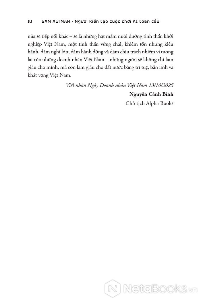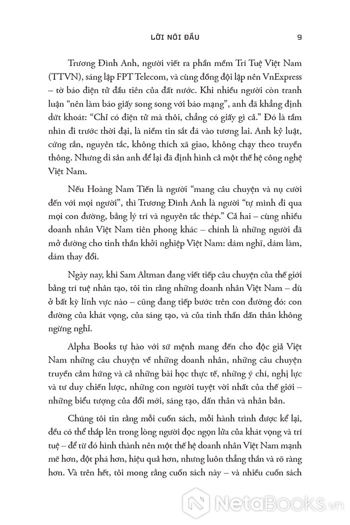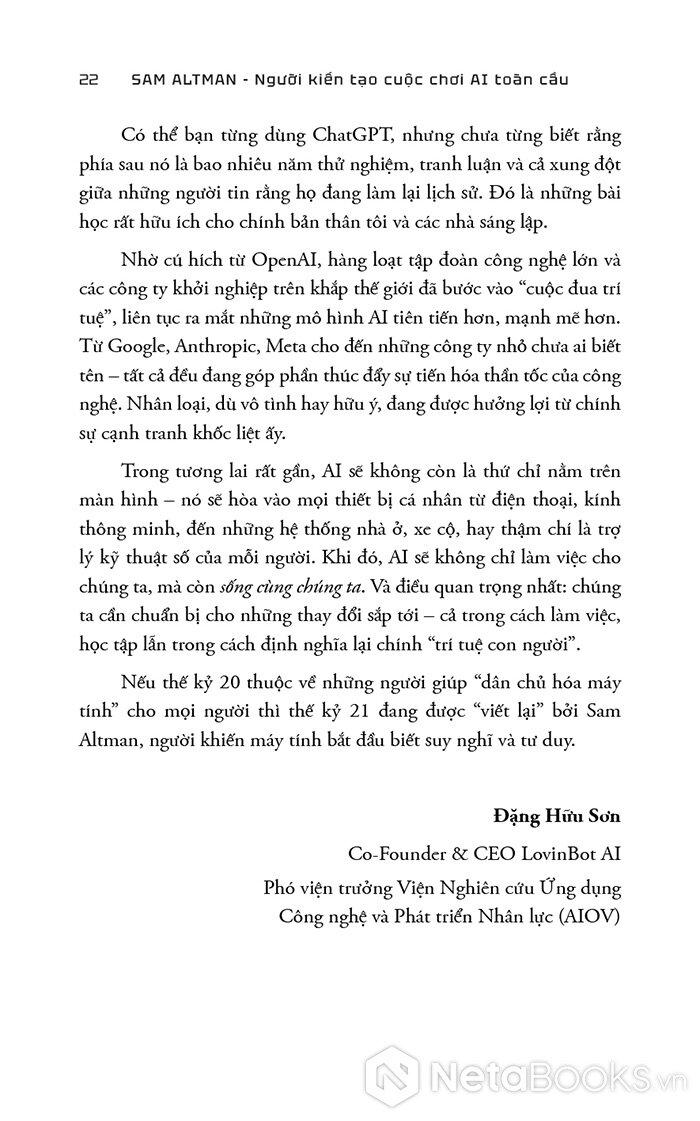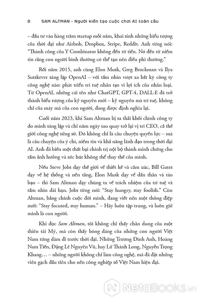Đây là một tác phẩm truyền cảm hứng, kết hợp giữa phân tích sâu sắc, thông tin độc quyền và câu chuyện nhân văn, dành cho bất kỳ ai muốn hiểu rõ AI đang thay đổi thế giới - và con người đang dẫn dắt nó.
