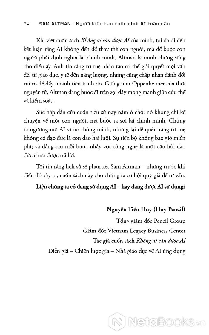 “Không chỉ là một tiểu sử, đây là sự phản chiếu sâu sắc về tương lai của AI. Một cuốn sách cần thiết để hiểu về Altman và OpenAI.” - Chu Hồng Y (Nhà sáng lập 360 Group)