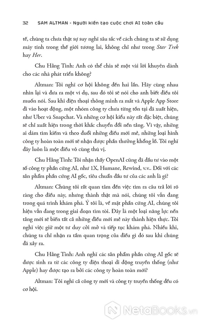 Sách Sam Altman - Người Kiến Tạo Cuộc Chơi AI Toàn Cầu của tác giả Chu Hằng Tinh, có bán tại Nhà sách online NetaBooks với ưu đãi Bao sách miễn phí và Gian hàng NetaBooks tại Tiki với ưu đãi Bao sách miễn phí và tặng Bookmark