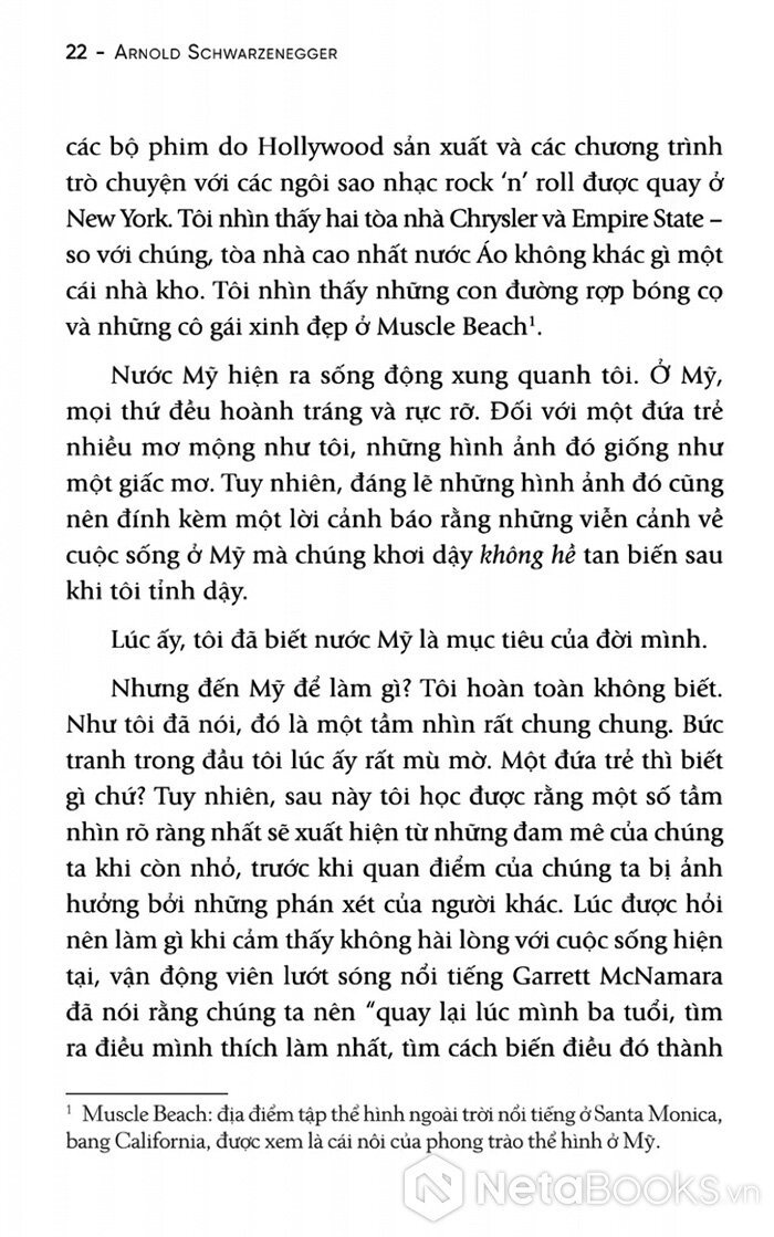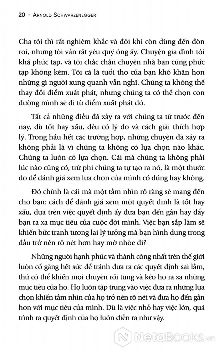 Những chia sẻ chân tình của Arnold Schwarzenegger trong gần 300 trang sách tập trung vào một mục tiêu duy nhất: giúp bạn trở thành phiên bản tốt hơn của chính mình - một người có tầm nhìn lớn, lòng nhân hậu, năng lực phục vụ cộng đồng và sức mạnh để hành động. Ông động viên chúng ta: “Cuộc đời không phải là buổi tổng duyệt trước khi trình diễn. Bạn chỉ sống duy nhất một lần. Hãy sống có ích”.