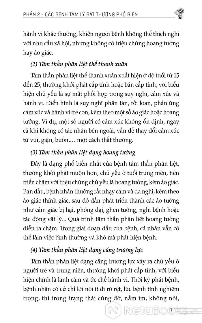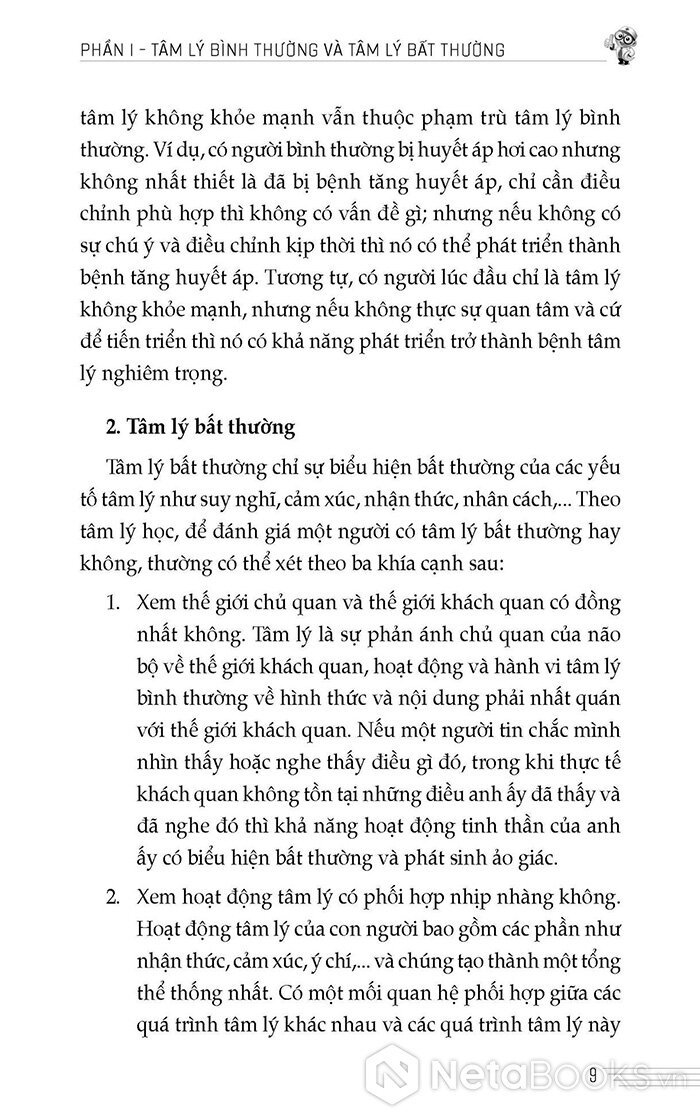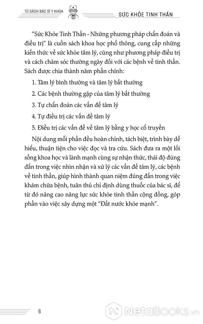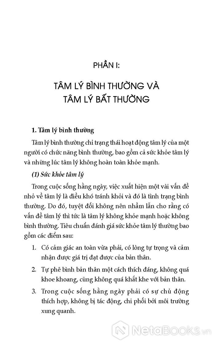 Cuốn sách cung cấp một cái nhìn toàn diện và khoa học về sức khỏe tinh thần trong bối cảnh xã hội hiện đại nhiều áp lực. Nội dung được chia làm năm phần mạch lạc, dẫn dắt người đọc từ việc phân biệt tâm lý bình thường và bất thường đến các bệnh lý phổ biến như trầm cảm, rối loạn lo âu, tự kỷ và suy nhược thần kinh.