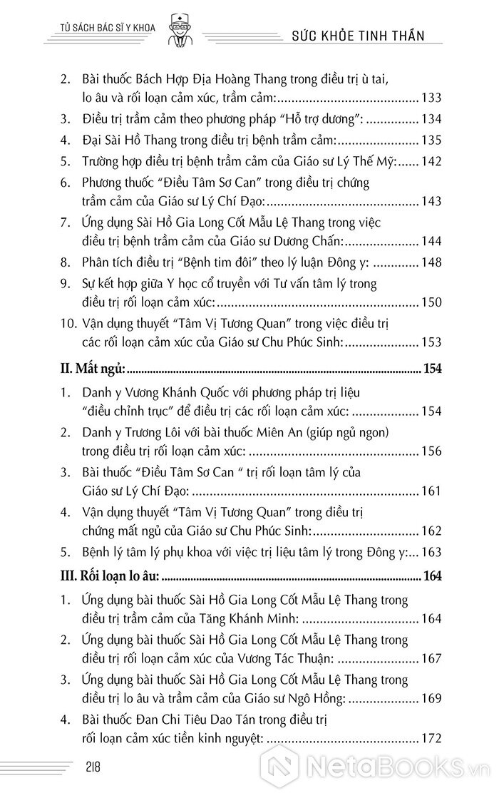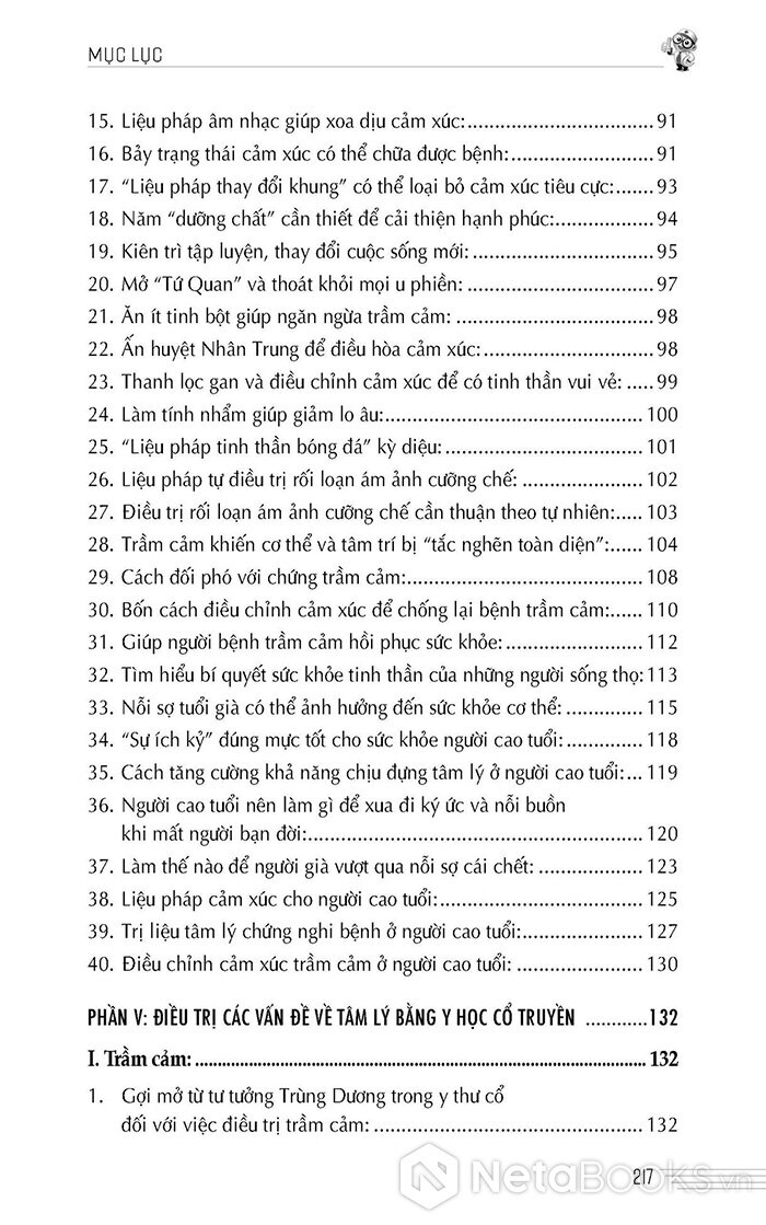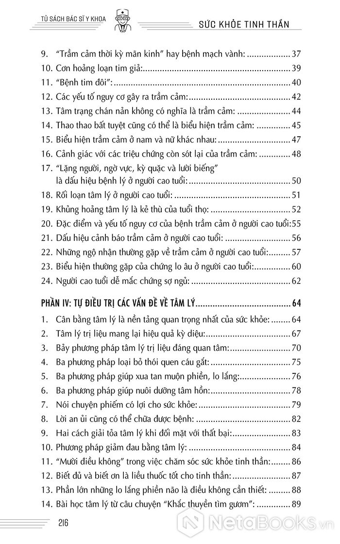 Đặc biệt, tác giả cung cấp các bộ công cụ giúp độc giả tự chẩn đoán và tự điều trị thông qua thay đổi lối sống, liệu pháp âm nhạc và cân bằng cảm xúc. Điểm nhấn độc đáo của tác phẩm là Phần V, trình bày các bài thuốc và phương pháp điều trị bệnh lý tâm thần bằng Y học cổ truyền từ các danh y nổi tiếng. Sách hướng tới việc nâng cao nhận thức cộng đồng, xóa bỏ định kiến về bệnh tâm lý và thúc đẩy một lối sống khoa học, lành mạnh cho mọi lứa tuổi, đặc biệt là người cao tuổi.