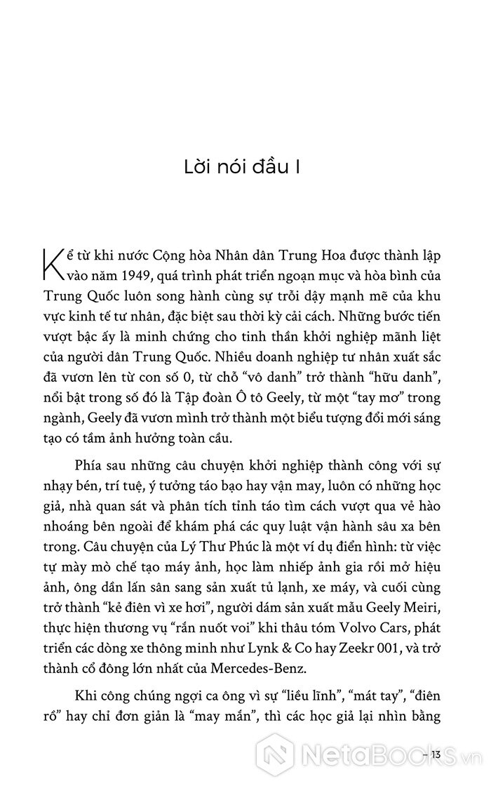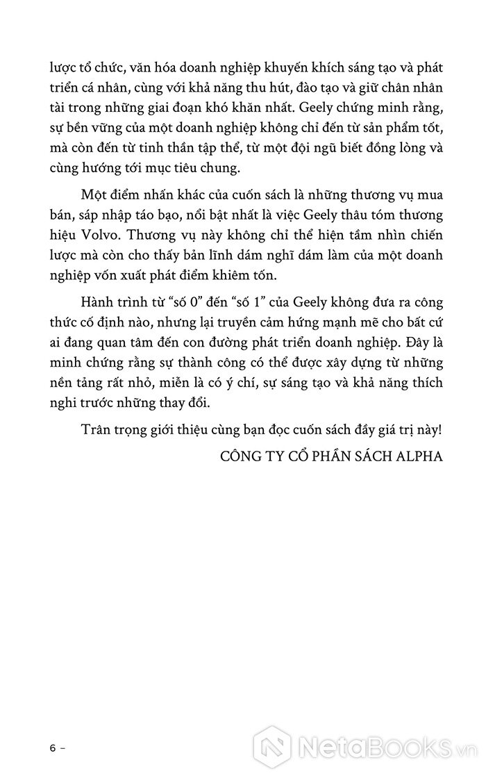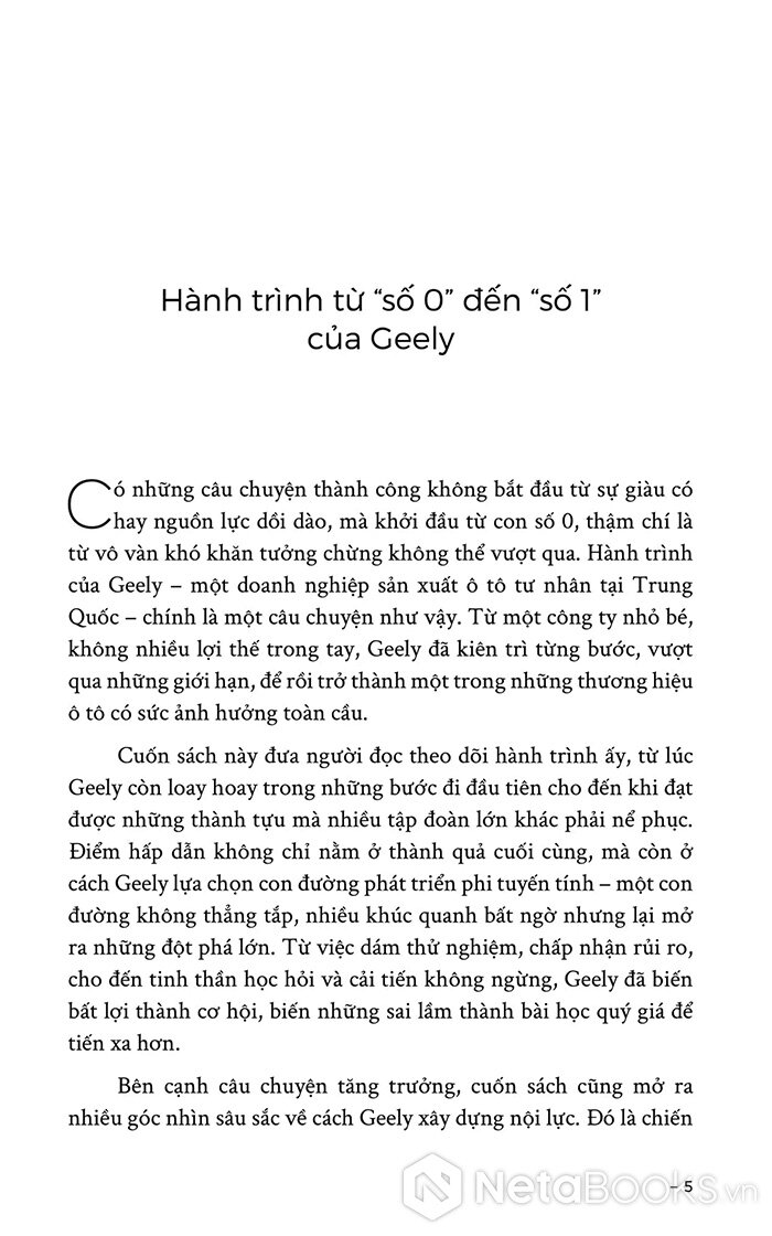 Cuốn sách phân tích cách Geely vừa duy trì trạng thái cân bằng để phát triển, vừa chủ động phá vỡ nó để tạo cú hích mới, từ đó chứng minh rằng: xuất phát điểm thấp không phải rào cản nếu doanh nghiệp dám đi con đường khác biệt.