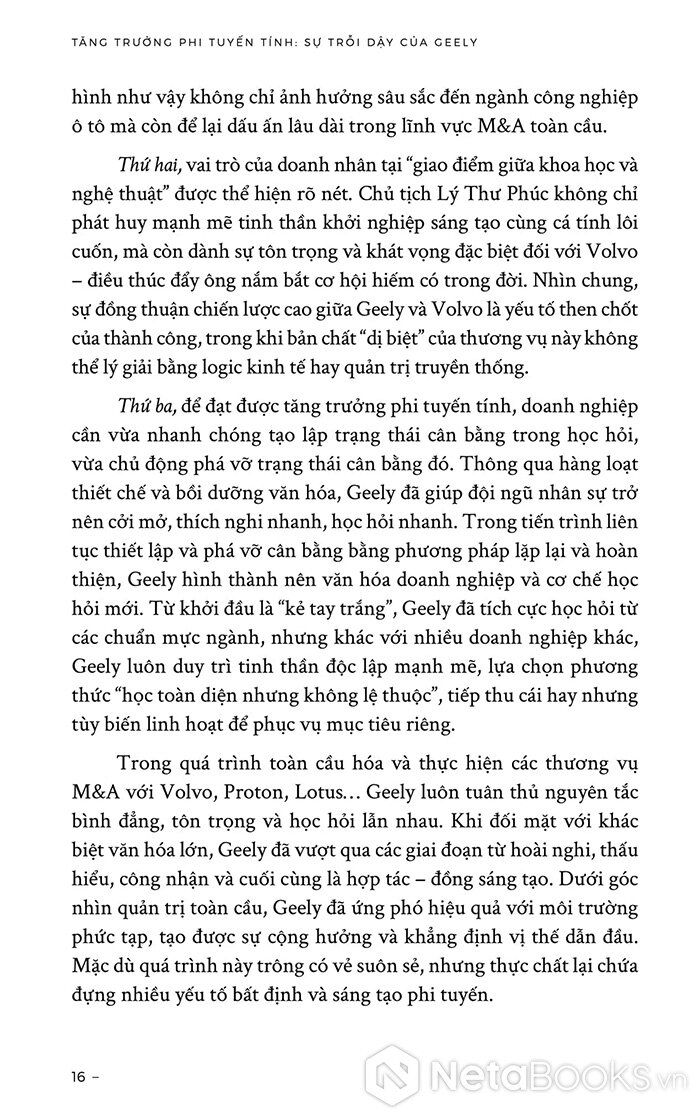Thay vì phát triển theo lộ trình tuyến tính truyền thống, Geely chọn con đường phi tuyến tính: mạnh dạn mua lại Volvo, Proton, Lotus, đồng thời áp dụng triệt để chiến lược đổi mới thứ cấp và học hỏi tổ chức.