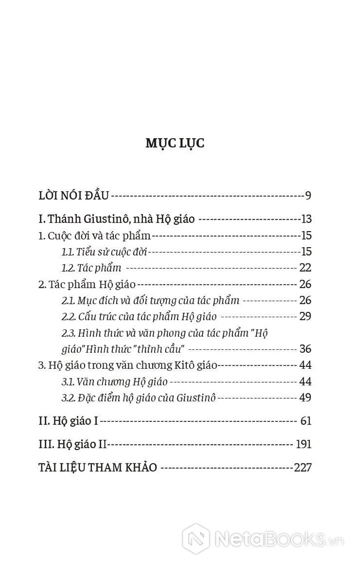 Tác phẩm bao gồm ba chương:Chương một bàn về cuộc đời và tác phẩm của thánh Giustinô. Thánh nhân sinh vào đầu thế kỷ II, sống trong môi trường đa văn hoá và đa tôn giáo, trở thành cầu nối giữa Kitô giáo và các nền văn hoá cũng như tôn giáo khác. Ngài viết nhiều tác phẩm, nhưng chỉ có hai tác phẩm được xem là đích thực của ngài: Biện luận cho các Kitô hữu (viết tắt là Hộ giáo) và Đối thoại với Trypho. Chương hai và chương ba là bản dịch và chú thích tác phẩm Hộ giáo, vốn phần lớn dựa trên những bộ sách chú giải của các học giả thời hiện đại.