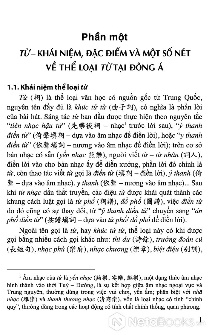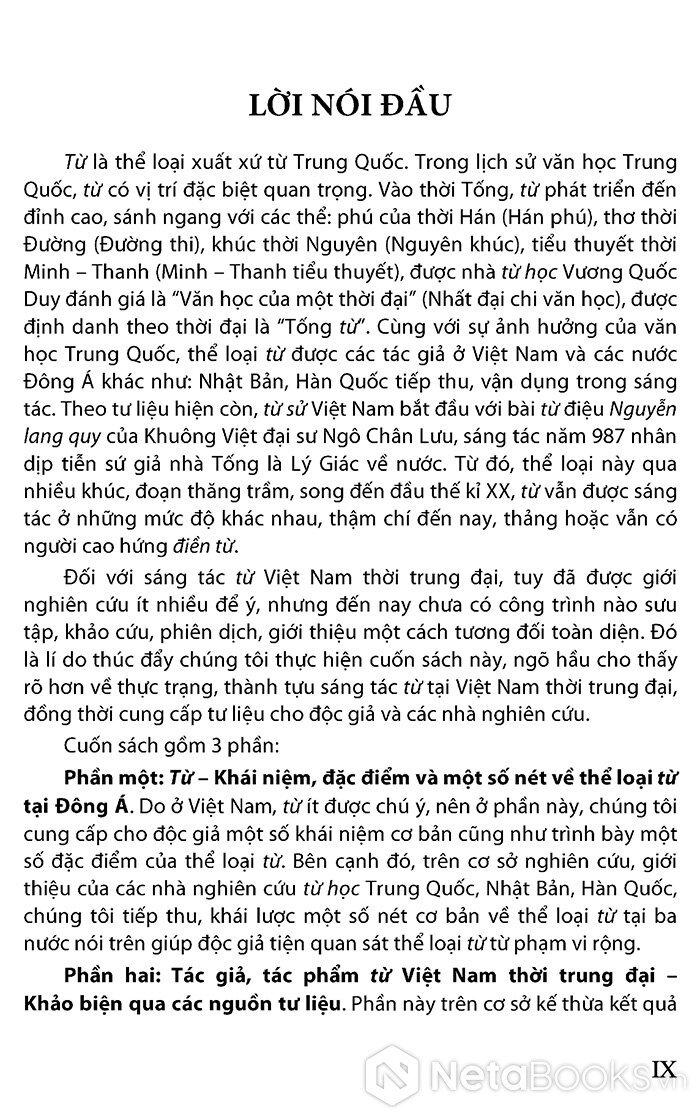- Phần một: Từ - Khái niệm, đặc điểm và một số nét về thể loại từ tại Đông Á. Do ở Việt Nam, từ ít được chú ý, nên ở phần này, chúng tôi cung cấp cho độc giả một số khái niệm cơ bản cũng như trình bày một số đặc điểm của thể loại từ. Bên cạnh đó, trên cơ sở nghiên cứu, giới thiệu của các nhà nghiên cứu từ học Trung Quốc, Nhật Bản, Hàn Quốc, chúng tôi tiếp thu, khái lược một số nét cơ bản về thể loại từ tại ba nước nói trên giúp độc giả tiện quan sát thể loại từ từ phạm vi rộng.