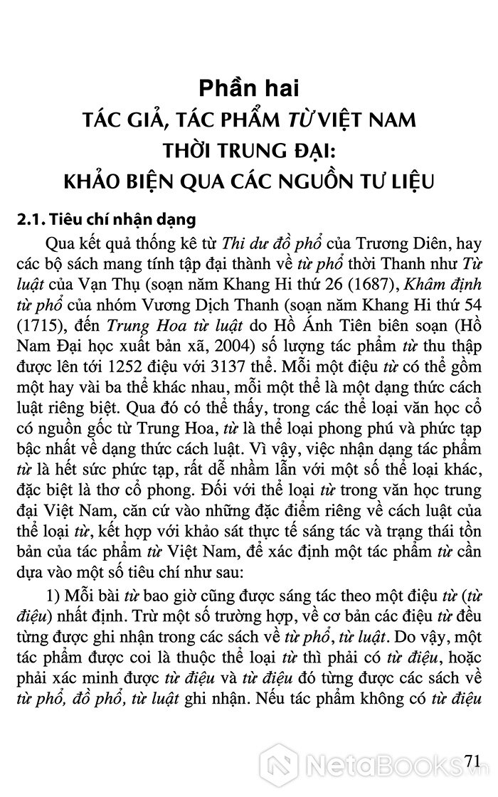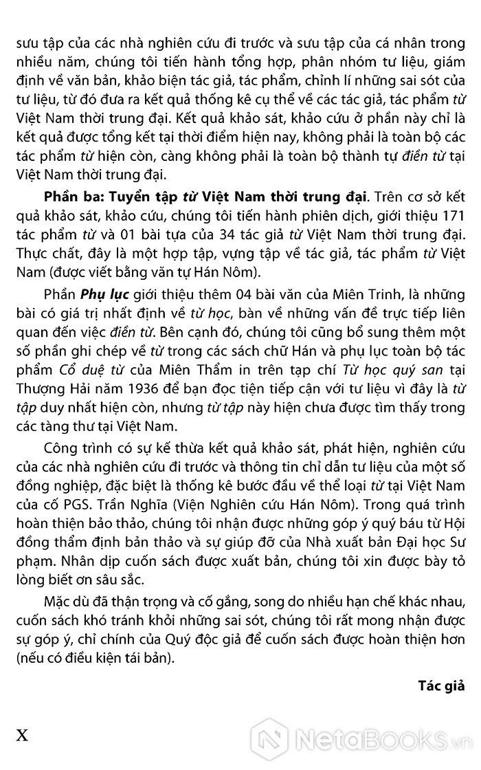 - Phần hai: Tác giả, tác phẩm từ Việt Nam thời trung đại - Khảo biện qua các nguồn tư liệu. Phần này trên cơ sở kế thừa kết quả sưu tập của các nhà nghiên cứu đi trước và sưu tập của cá nhân trong nhiều năm, chúng tôi tiến hành tổng hợp, phân nhóm tư liệu, giám định về văn bản, khảo biện tác giả, tác phẩm, chỉnh lí những sai sót của tư liệu, từ đó đưa ra kết quả thống kê cụ thể về các tác giả, tác phẩm từ Việt Nam thời trung đại. Kết quả khảo sát, khảo cứu ở phần này chỉ là kết quả được tổng kết tại thời điểm hiện nay, không phải là toàn bộ các tác phẩm từ hiện còn, càng không phải là toàn bộ thành tự điền từ tại Việt Nam thời trung đại.
