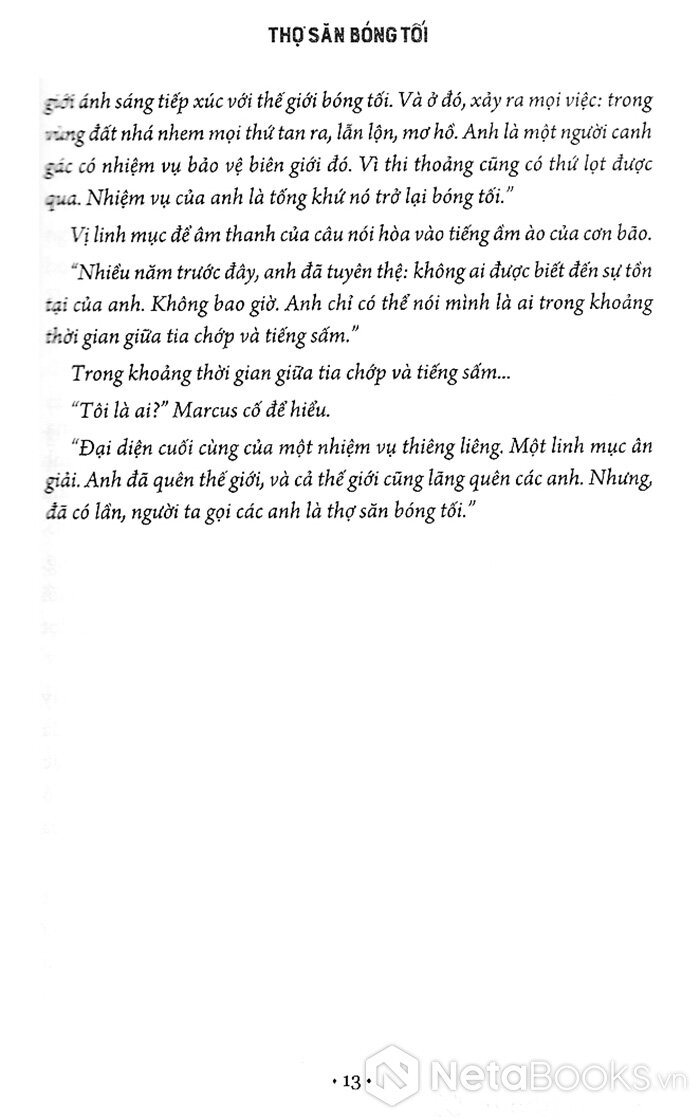 Anh nhớ lại những lời của Clemente. Trong cuộc sống trước kia của anh, Marcus đã tuyên thệ: không ai được biết đến sự tồn tại của anh. Với tất cả, anh là kẻ vô hình. Một linh mục ân giải chỉ có thể xuất hiện trước những người khác, tiết lộ danh tính thật của mình trong khoảng thời gian giữa tia chớp và tiếng sấm. Một khoảng nghỉ mong manh diễn ra trong tích tắc hoặc vô tận, không ai có thể biết được. Mọi chuyện đều có thể trong thời khắc mà người ta nhận thấy không khí được tiếp sức bởi năng lượng phi thường và niềm mong chờ thấp thỏm. Đó là khoảnh khắc bấp bênh và mơ hồ, khi những hồn ma trở lại hình hài con người. Và xuất hiện trước những người sống.